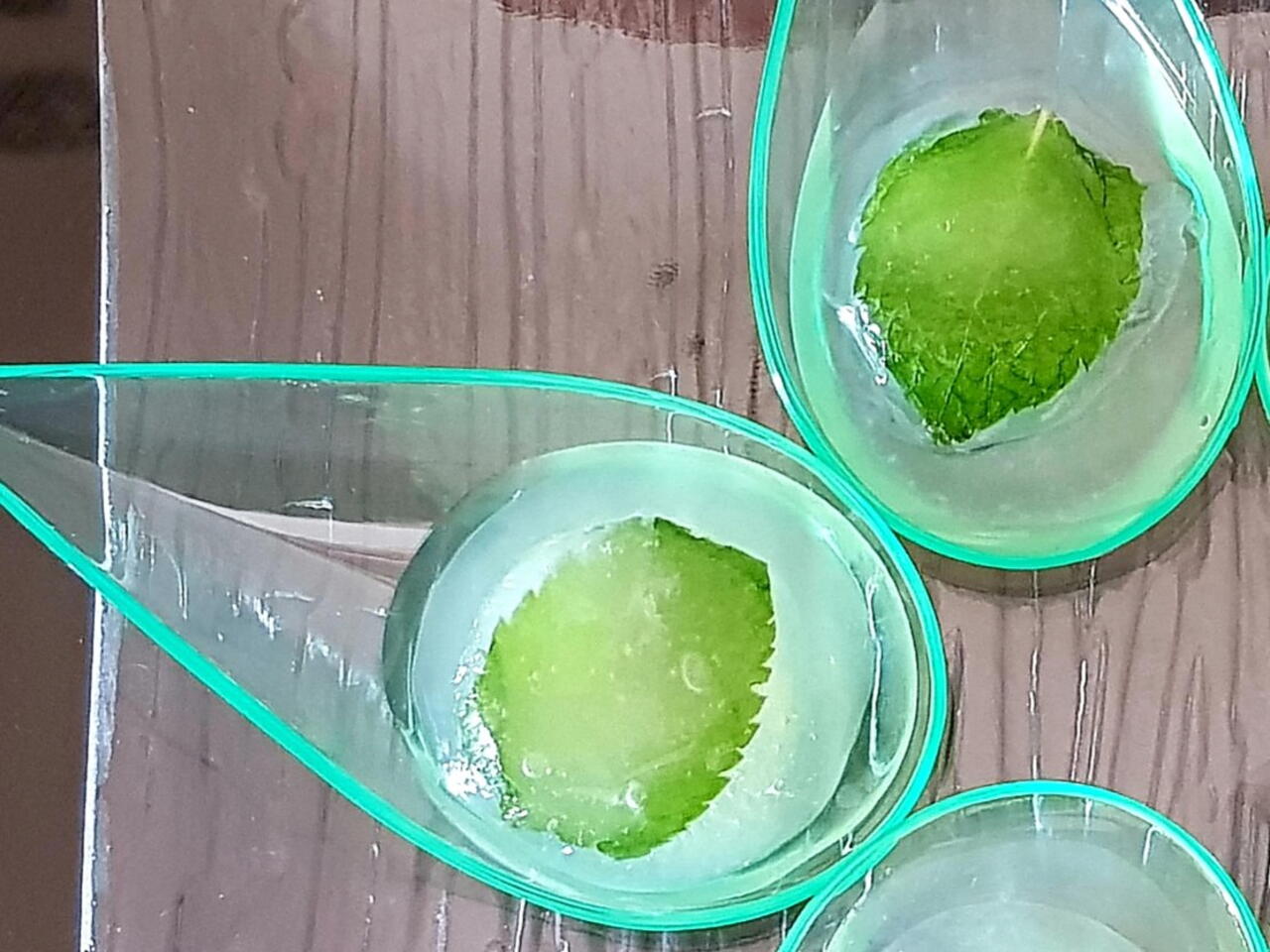 Pasado los tres minutos la retiramos y le damos un baño de agua para quitar el alginato y luego lo colocamos en unas cucharas y listas para probar un rico coctel molecular