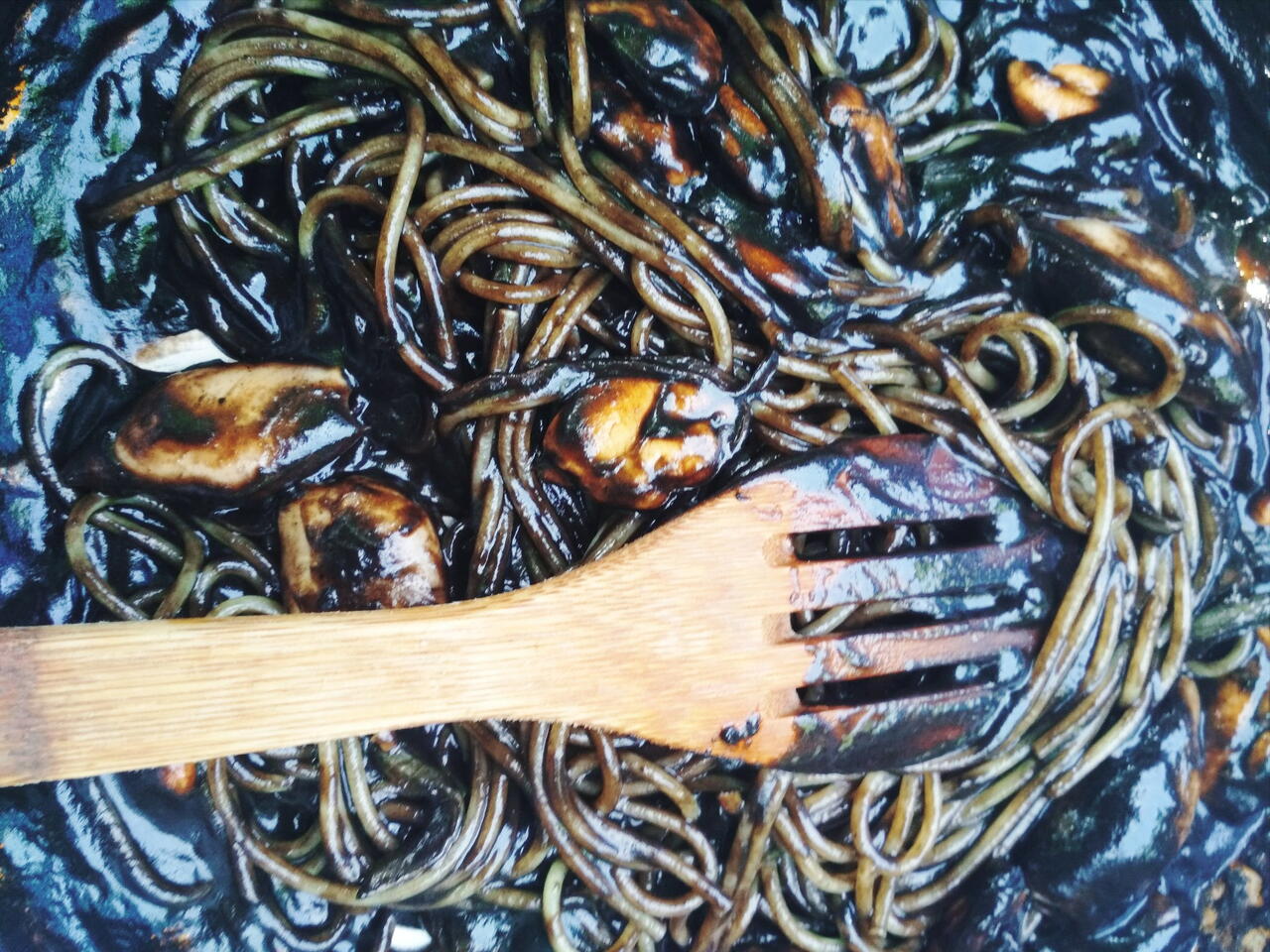 Un poco antes que estén echos los chipirones echar unos cuantos mejillones sin la cáscara remover hasta que esté todo hecho y echar la tinta callamar y remover.