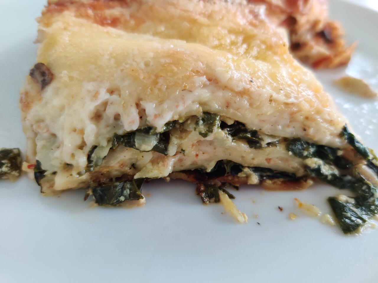 Una vez tenemos la base de espinacas, dejamos templar y añadimos la riccotta. Mezclamos todo bien. Engrasamos con mantequilla el bol para hornear y colocamos placas de lasaña precocinadas, luego hacemos una capa de espinacas (la mitad) , volvemos a colocar otra capa de pasta, luego bechamel, y repetimos la capa de espinacas y bechamel. Terminamos con una capa de queso para gratinar.