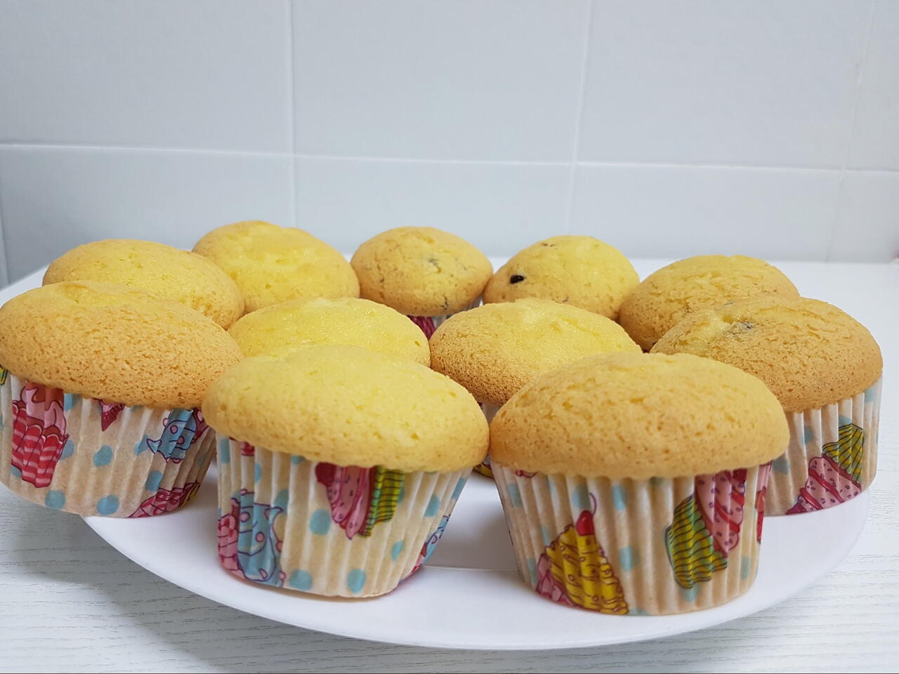 Rellenamos cada tartaleta de magdalenas hasta la mitad o un poquito más y las ponemos en una bandeja de agujeros de las que se utilizan para ello.