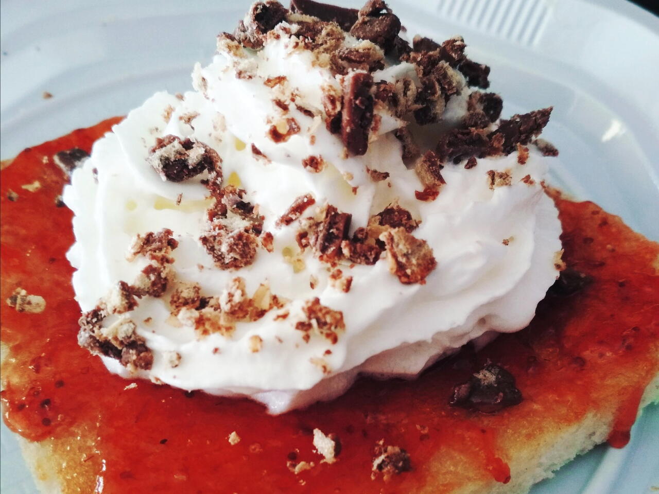 Poner encima la nata al gusto, y machacar una barrita de Kit Kat y poner por encima al gusto 😋🍧