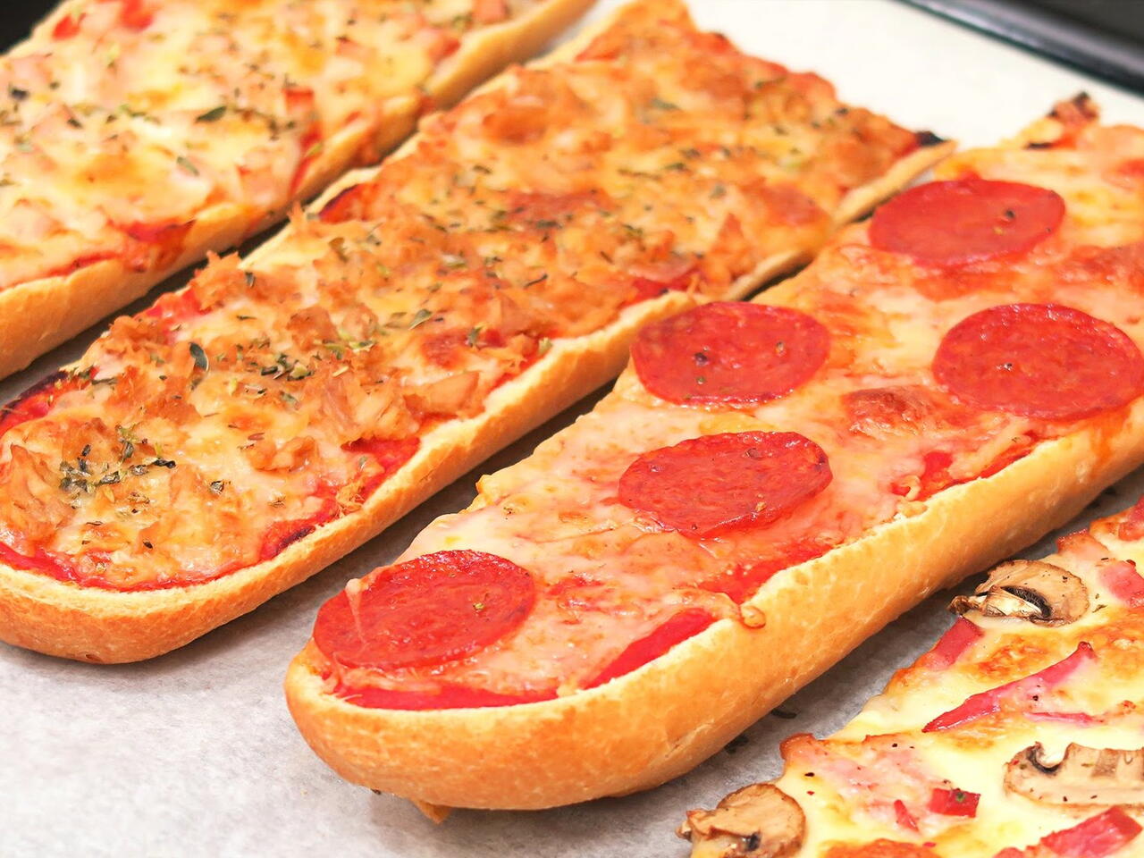 Cortar la barra de pan por la mitad en horizontal y luego en vertical.