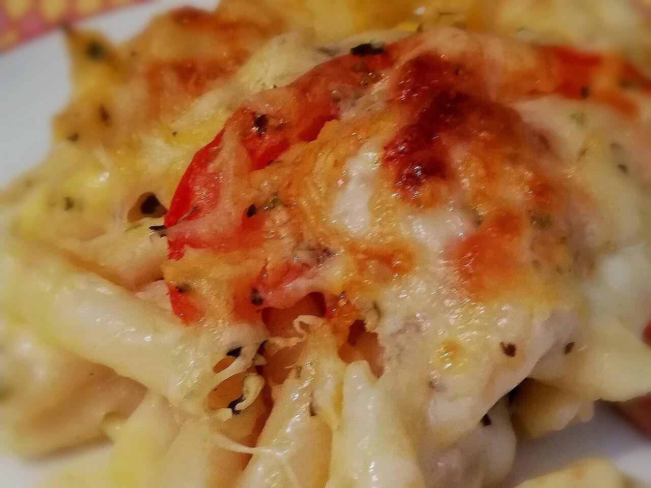 Cocemos la pasta que quede al punto, porque luego con el horno se termina de hacer. Precalentamos un sartén con aceite de oliva y ponemos a sofreir los dientes de ajo, la cebolla y el pimentón. Cuando ya estén sofritos, añadimos las tarrinas de bacon y los tomates cherrys picados, cuando estén doradas las tiras de bacon, añadimos 2 cucharadas de nata fresca, removemos hasta que se deshaga, añadimos nata para cocinar (la vamos a ir añadiendo momentáneamente)