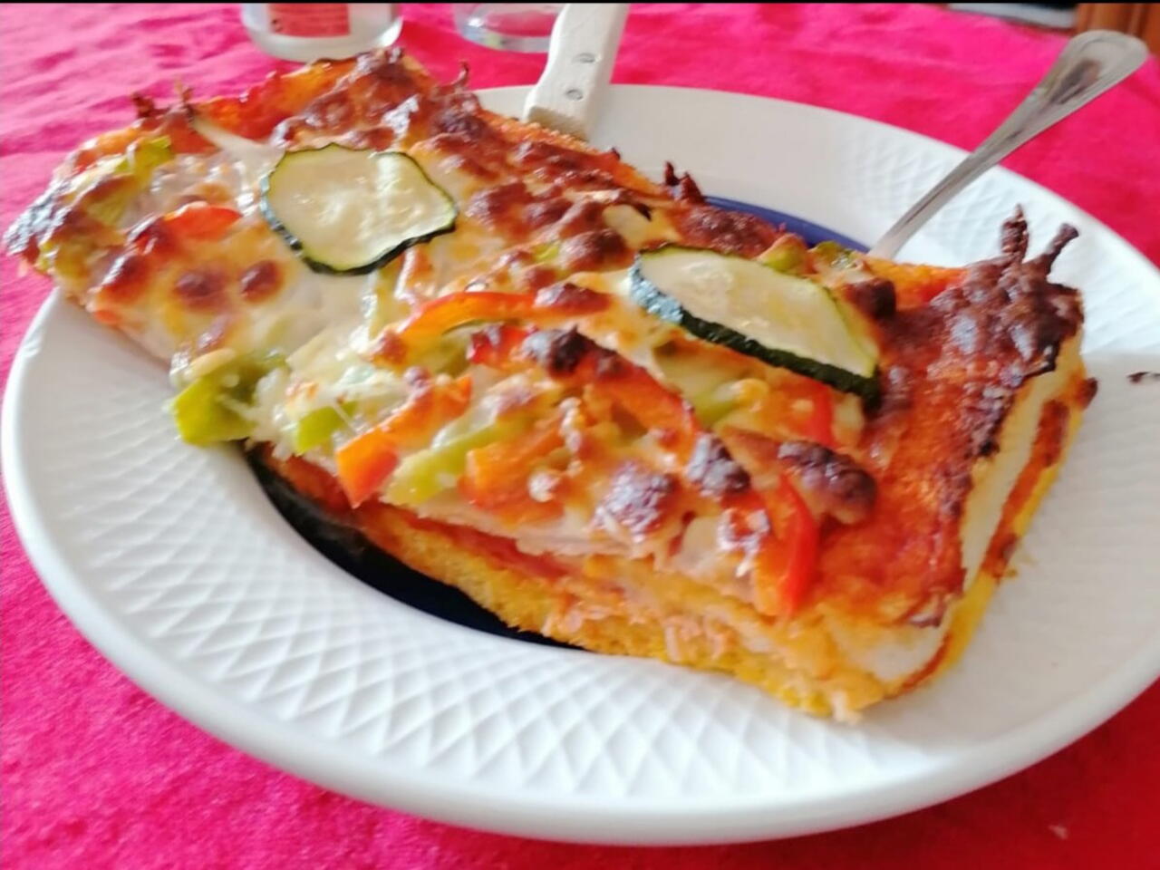 Hacemos otra capa con las rebanadas restantes: cubrimos con tomate, queso, 50 g de jamón cocido y colocamos las verduras.