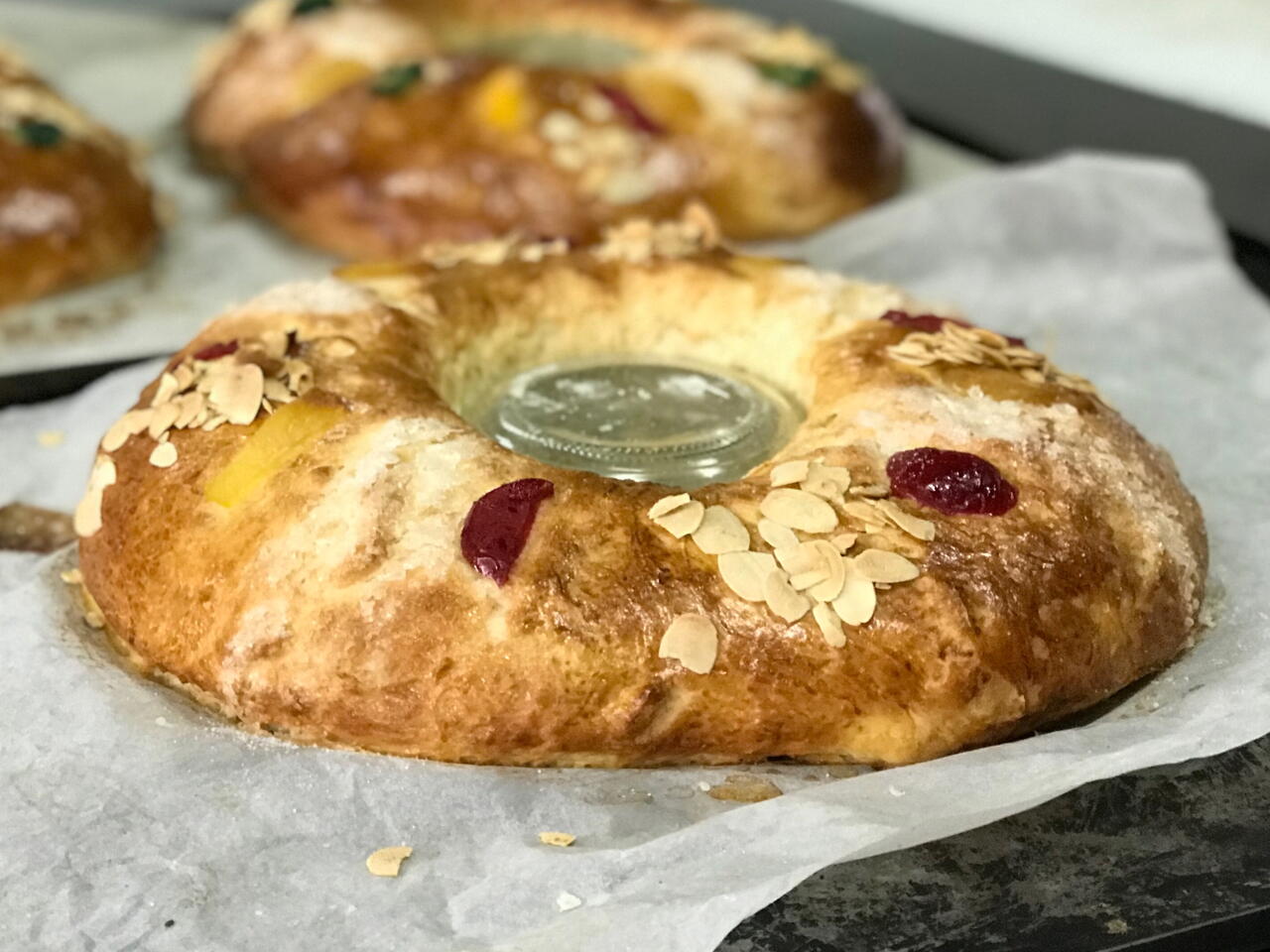 Pintar con huevo batido y decorar con fruta escarchada, almendra laminada y azúcar humedecido.