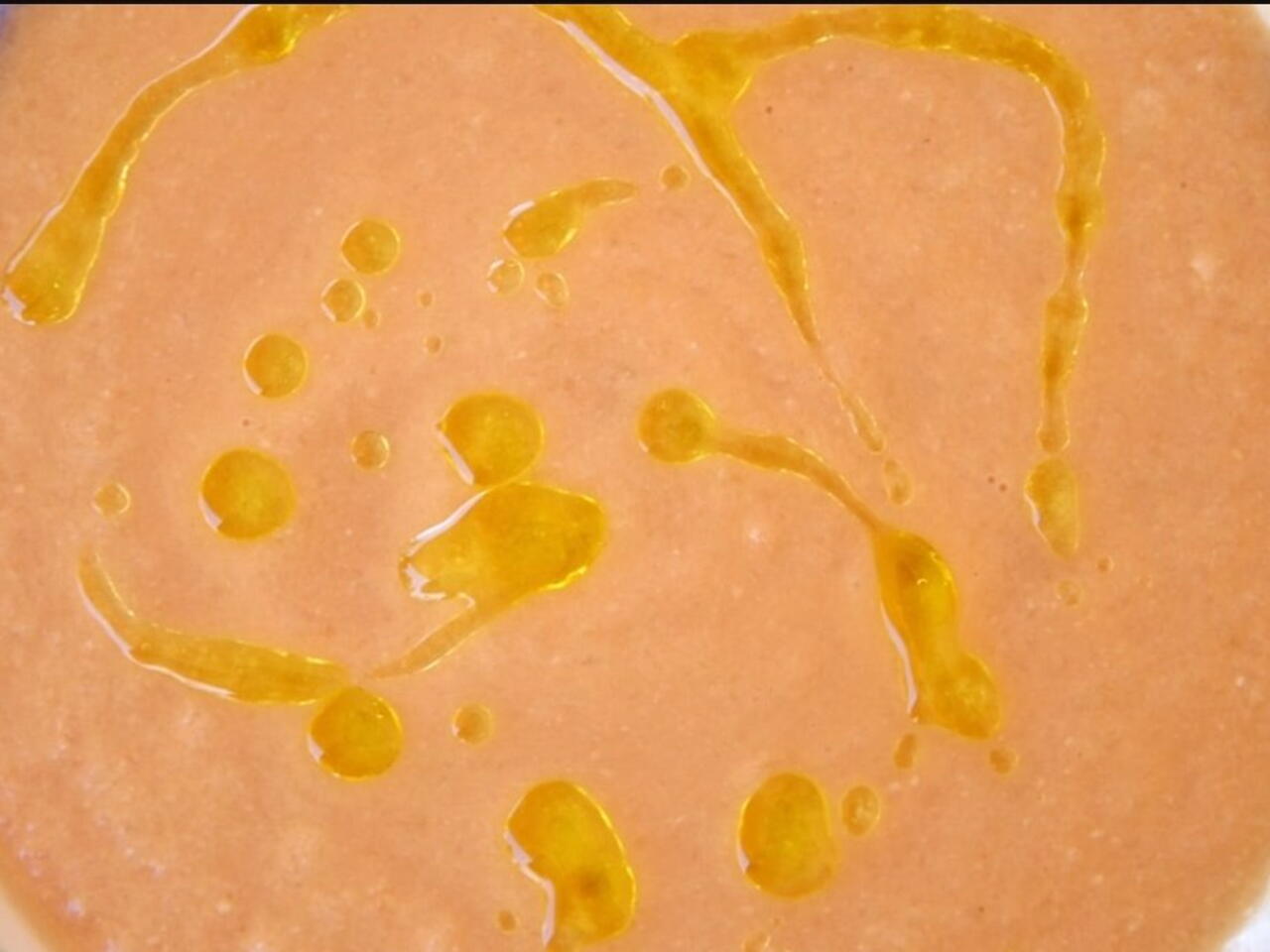 En una licuadora o con la batidora de mano, se ponen los tomates lavados, el pimiento lavado y sin pepitas, el diente de ajo pelado, un chorro de aceite (al gusto), sal (al gusto), el pan previamente mojado y a licuar. Una vez licuado se pasa por el chino y a la nevera! Se puede presentar con tacos de jamón serrano, un huevo duro o trozos de verduras... de recupete! 😋