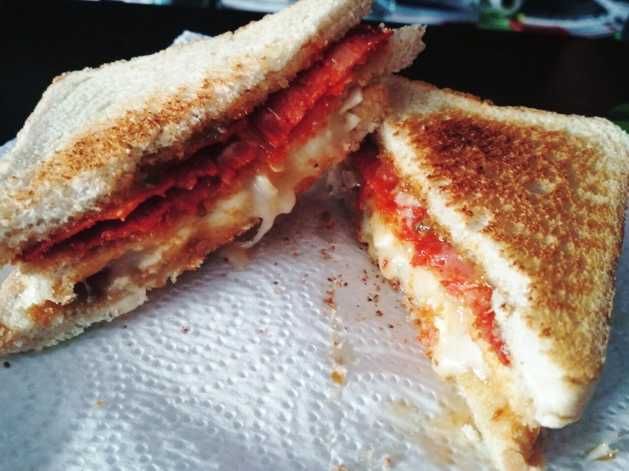 1. Tostar tres rebanadas de pan de sanwich con aceite,🍞🍞🍞 y calentar el chorizo de pavo y el queso hasta que se funda.