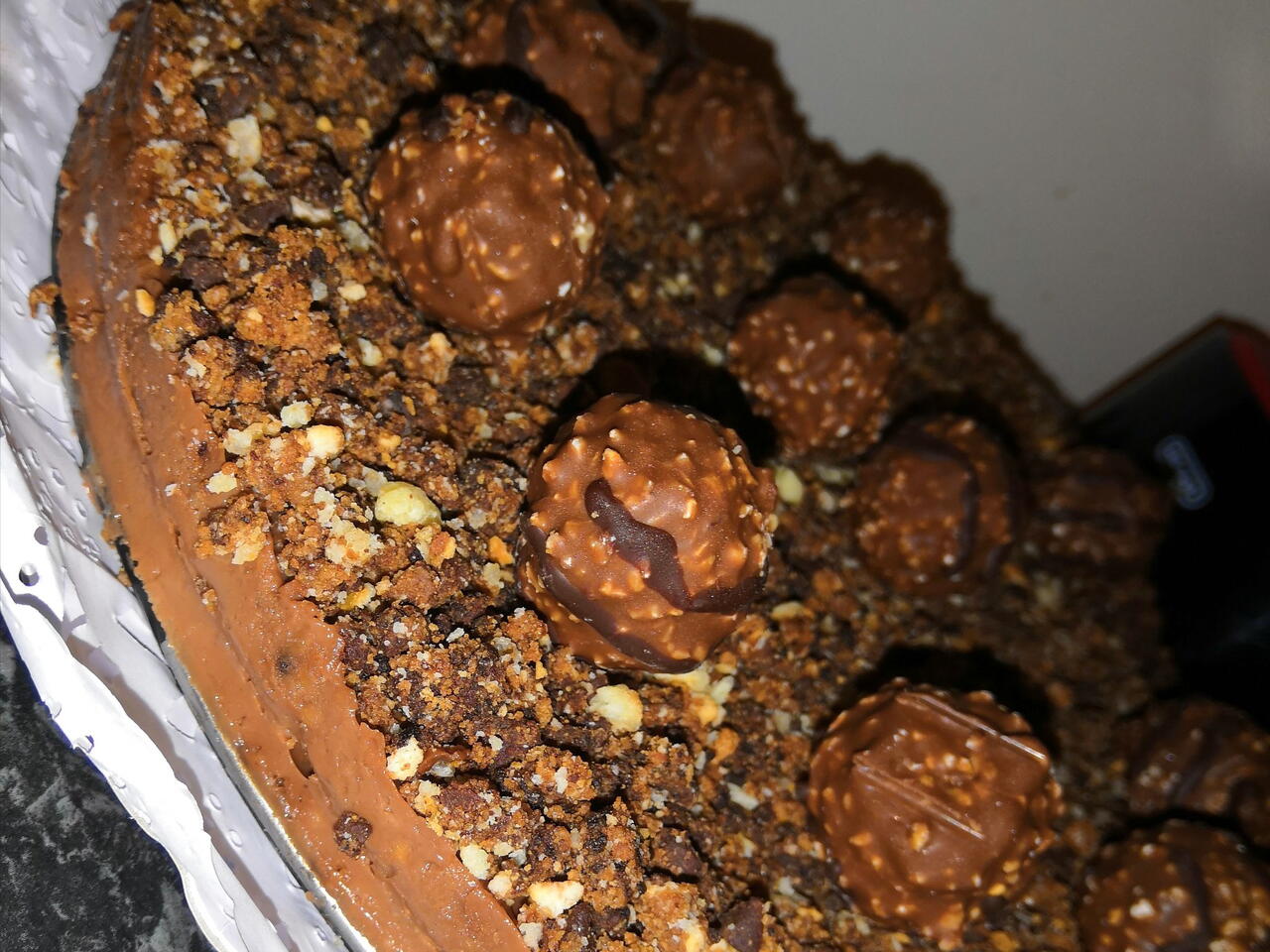 Ponemos a hervir la leche junto con la Nutella,el Ferrero,y 30gr de nata para montar,cuando hierva echaremos la gelatina. Dejamos la mezcla a 65c para añadirle las yemas echaremos la yema sin dejar de remover. Seguidamente montaremos los 20gr restantes de nata y le iremos añadiendo en tres partes removemos ,por último vertemos la.mezcla en la base ya untada en el molde y dejamos que se enfrie