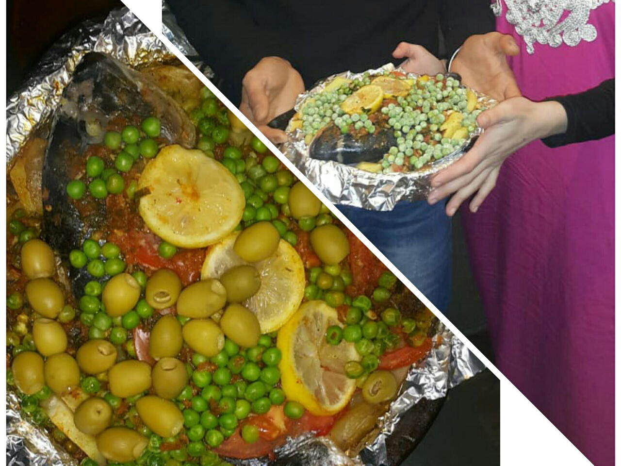 Para que pescado este feliz 😃. Después añadimos gisantes, aceitunas, tomate en rodajas, limón en rodajas y listo 40minutos lo cocinamos y listo que aproveche.