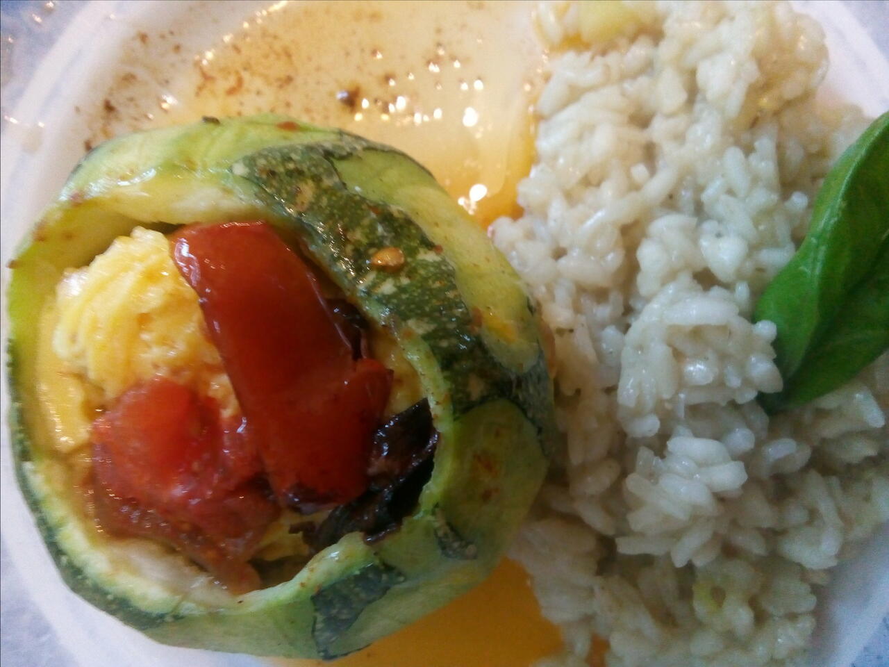 Mettre les courgettes ainsi qu'une rondelle de tomate à l'intérieur. Remplissez avec œufs battus et les herbes aromatiques.