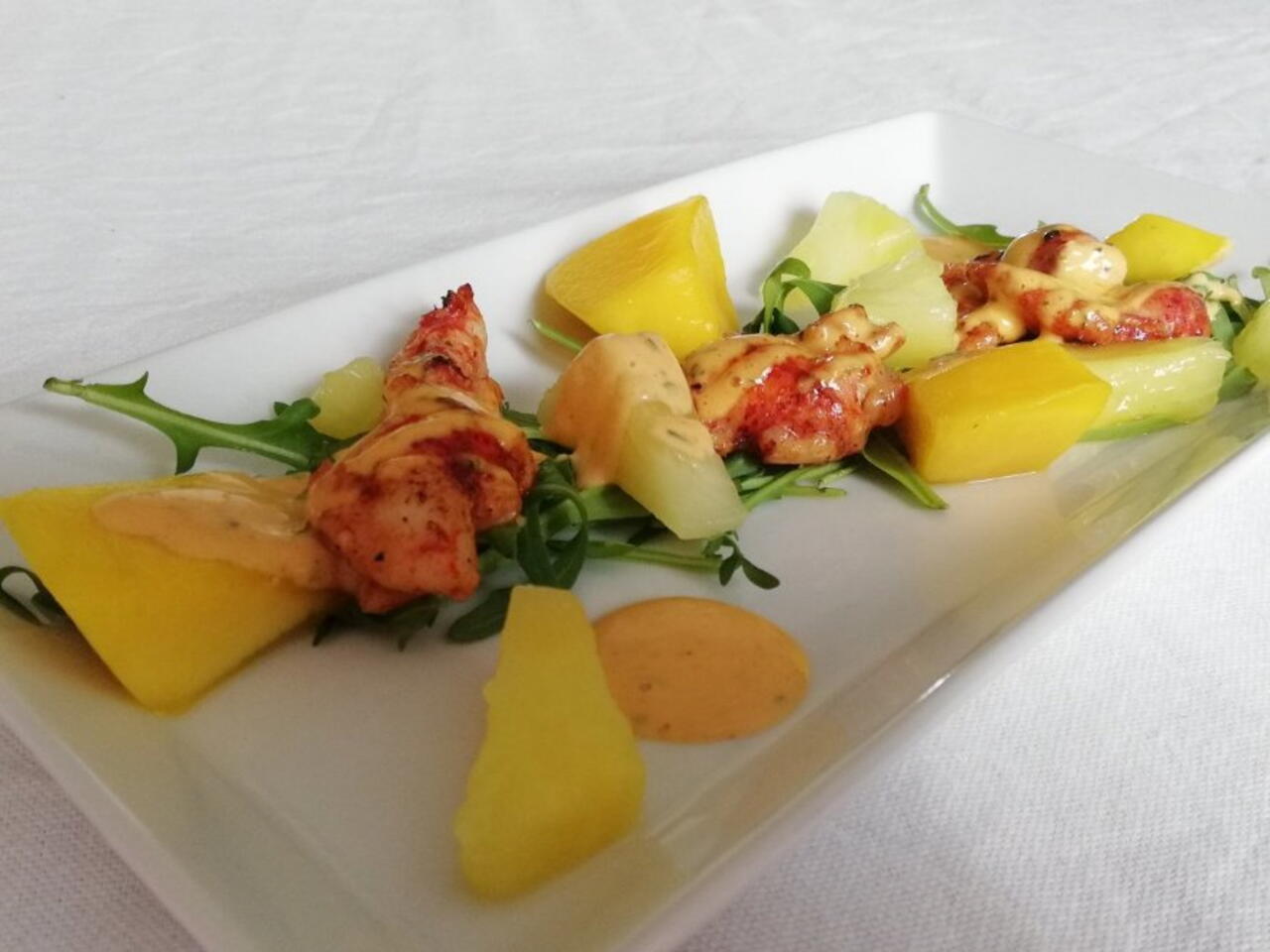 Faire un lit de salade avec la roquette sur assiette. Ajouter les morceaux de fruits frais, le homard et décorer d'un peu de sauce. Déguster.