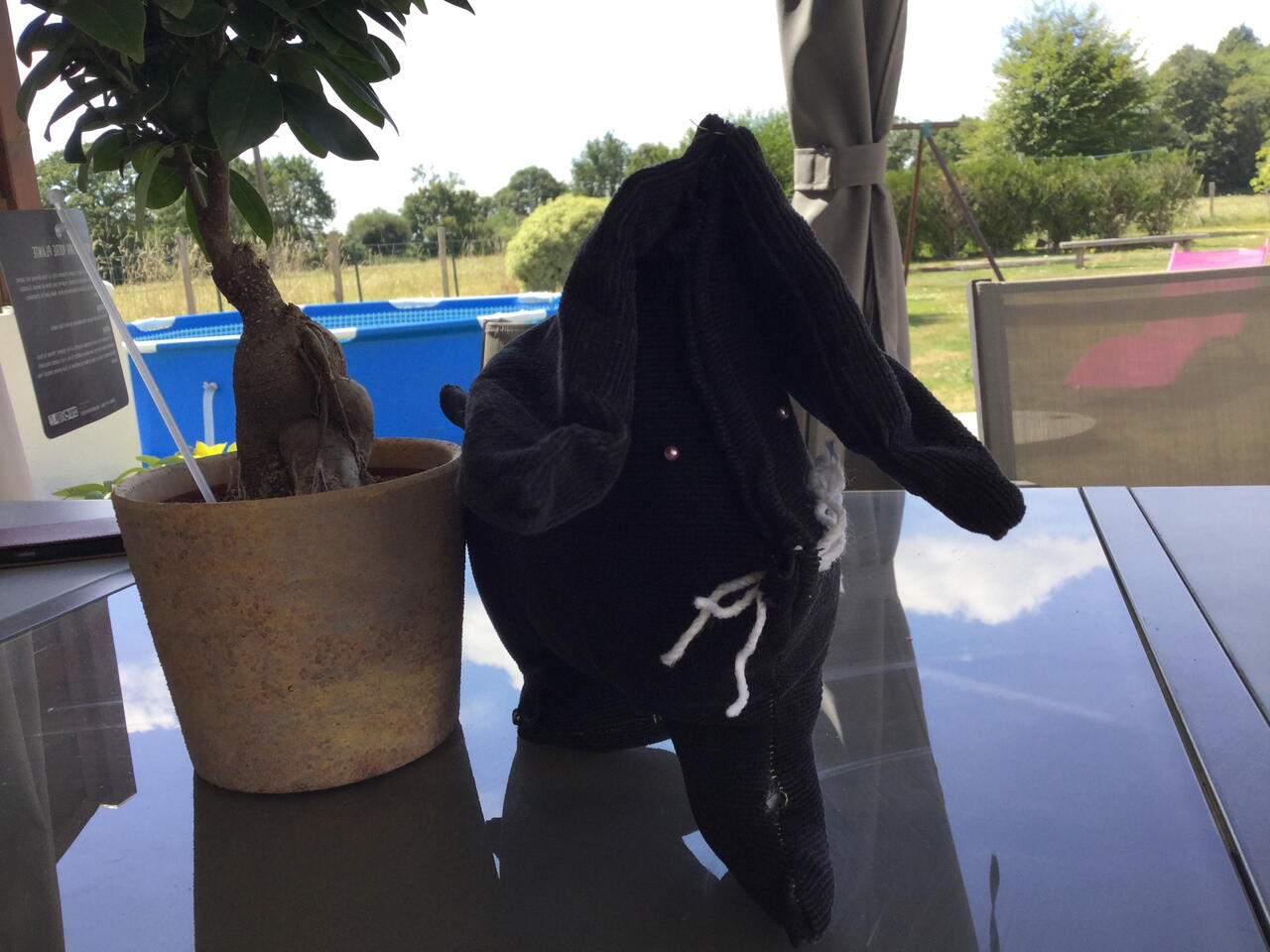 Découper la forme du chien, construire deux oreilles et cousez-les,faire un trou au niveau de la gueule et mettez deux épingles pour faire les yeux et c’est fini !!🐶