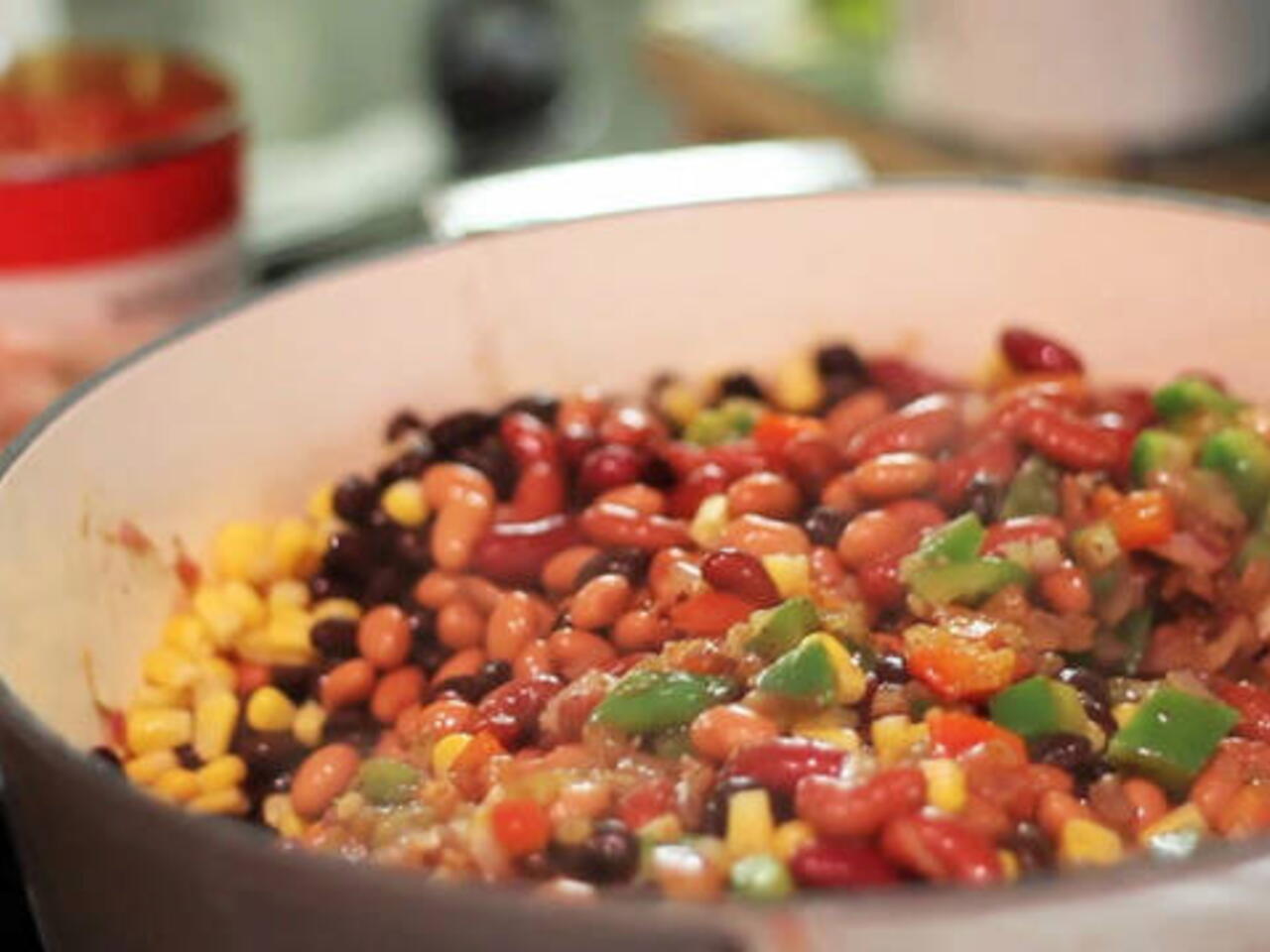 Ajouter toutes les épices + sauce soya, mélanger. Ajouter les fèves + maïs, mélanger.