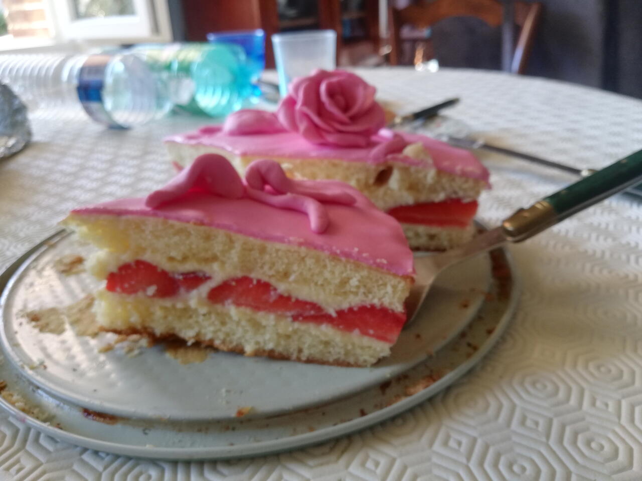Poncher le dessus du fraisier délicatement et poser le sur la crème. Garder bien le côté lisse au dessus !