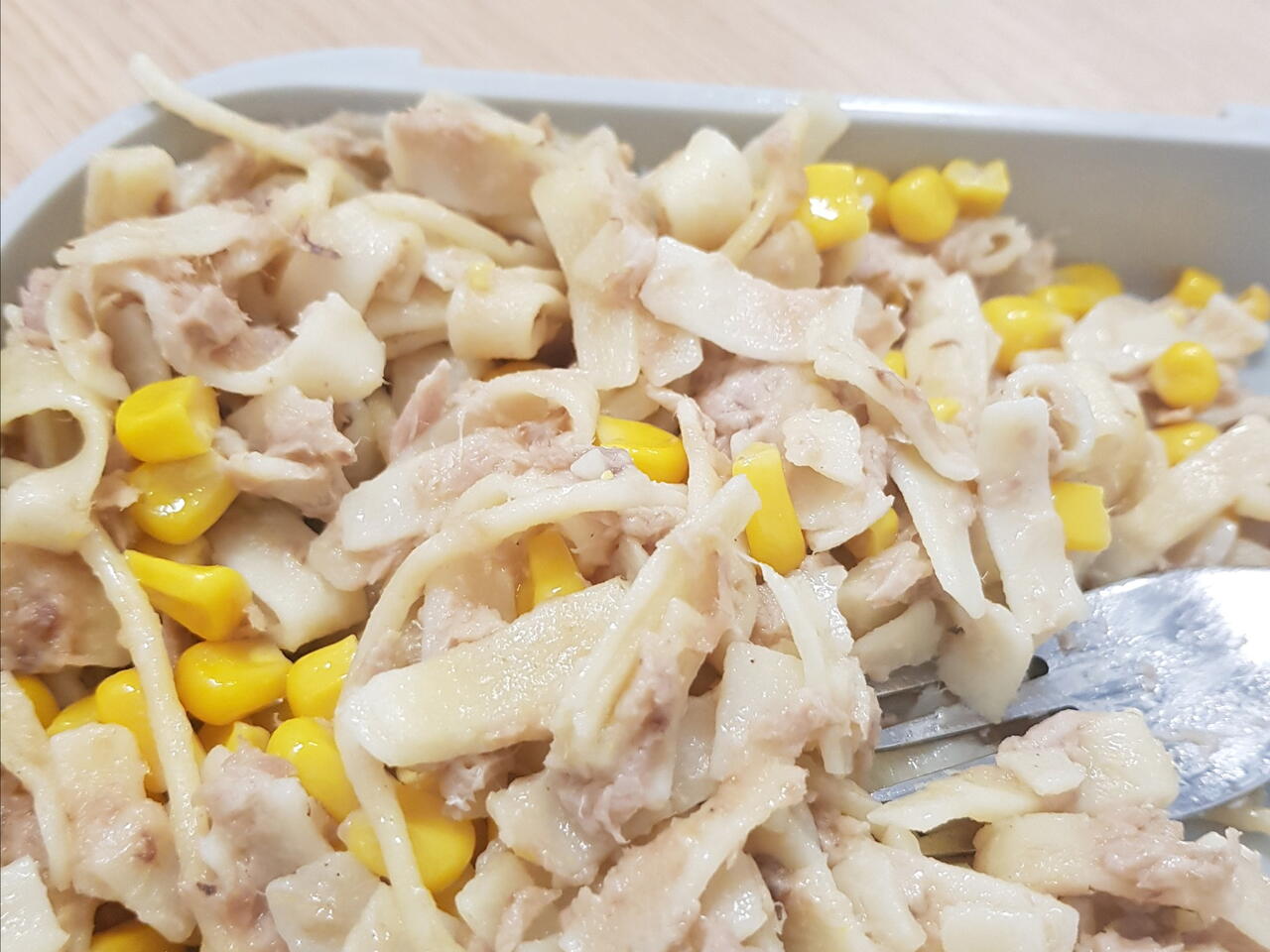 Pate ou spaghettis au thon mais et béchamel. Recette très simple pour changer, se mange chaud ou froid. Ça change des pâtes carbonara et bolognaise.