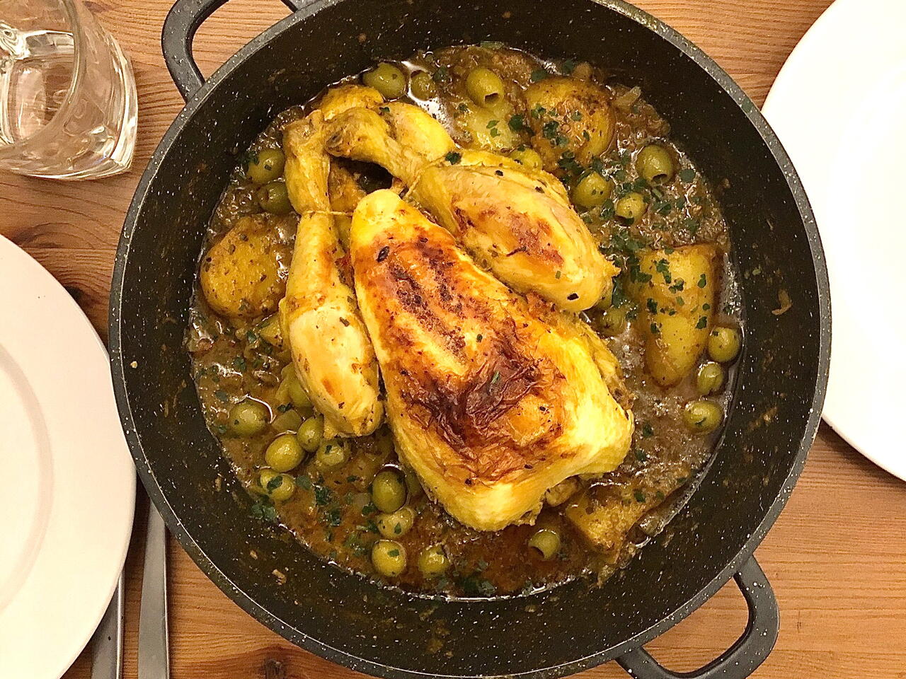 C’est prêt ! Disposer la sauce dans un plat, le poulet et les olives (sans la sauce dans laquelle elles ont cuites).