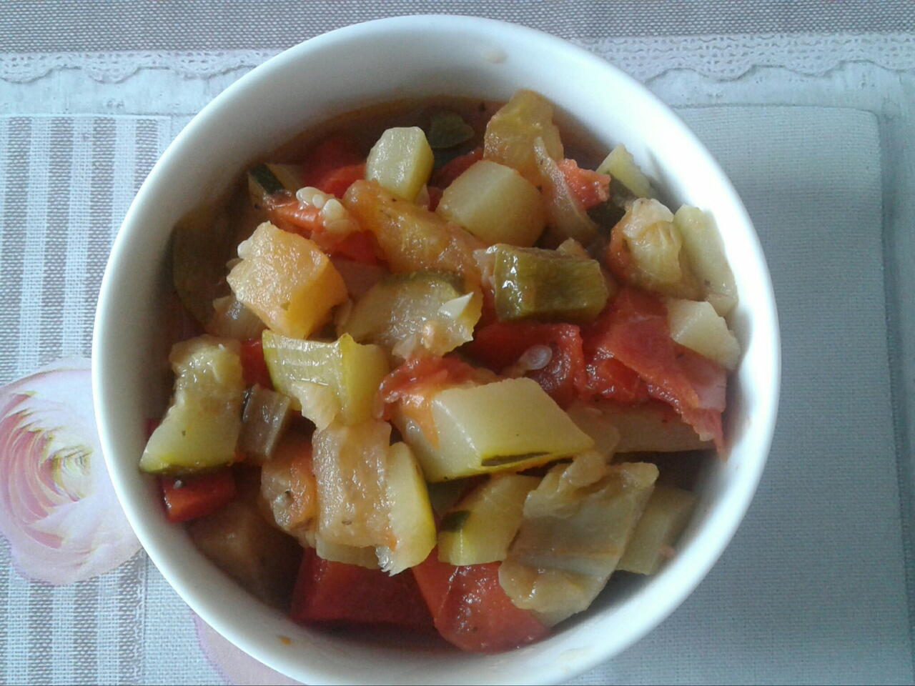 Peler et découper les aubergines, courgettes et les tomates et les ajouter au poivrons.