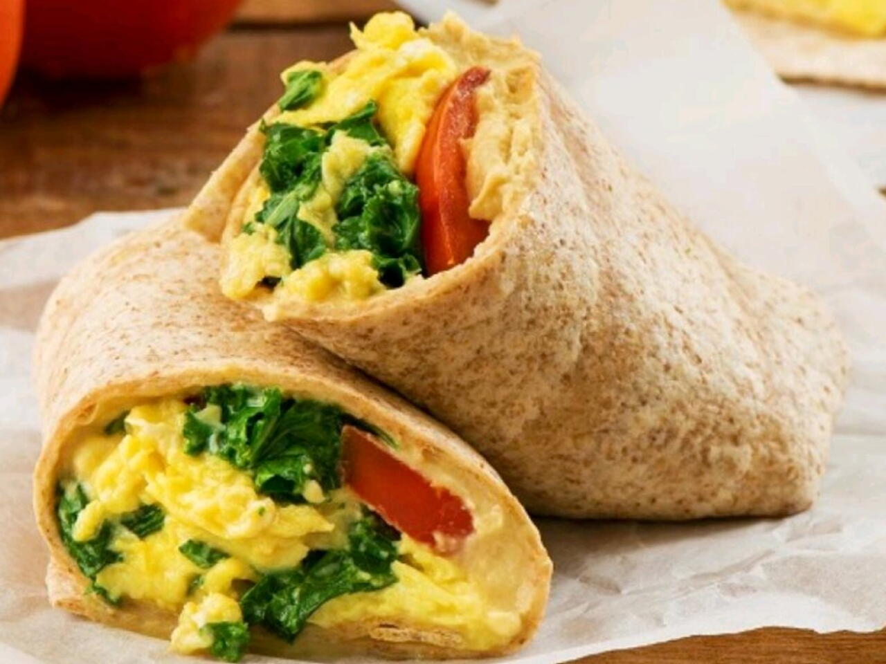 Placer les tortillas sur une surface de travail. Étendre de l’houmous le long du centre de chaque tortilla, en laissant un espace près des extrémités. Garnir de tomates et du mélange aux œufs brouillés. Plier le bas de chaque tortilla sur la garniture, puis replier les côtés et rouler fermement.
