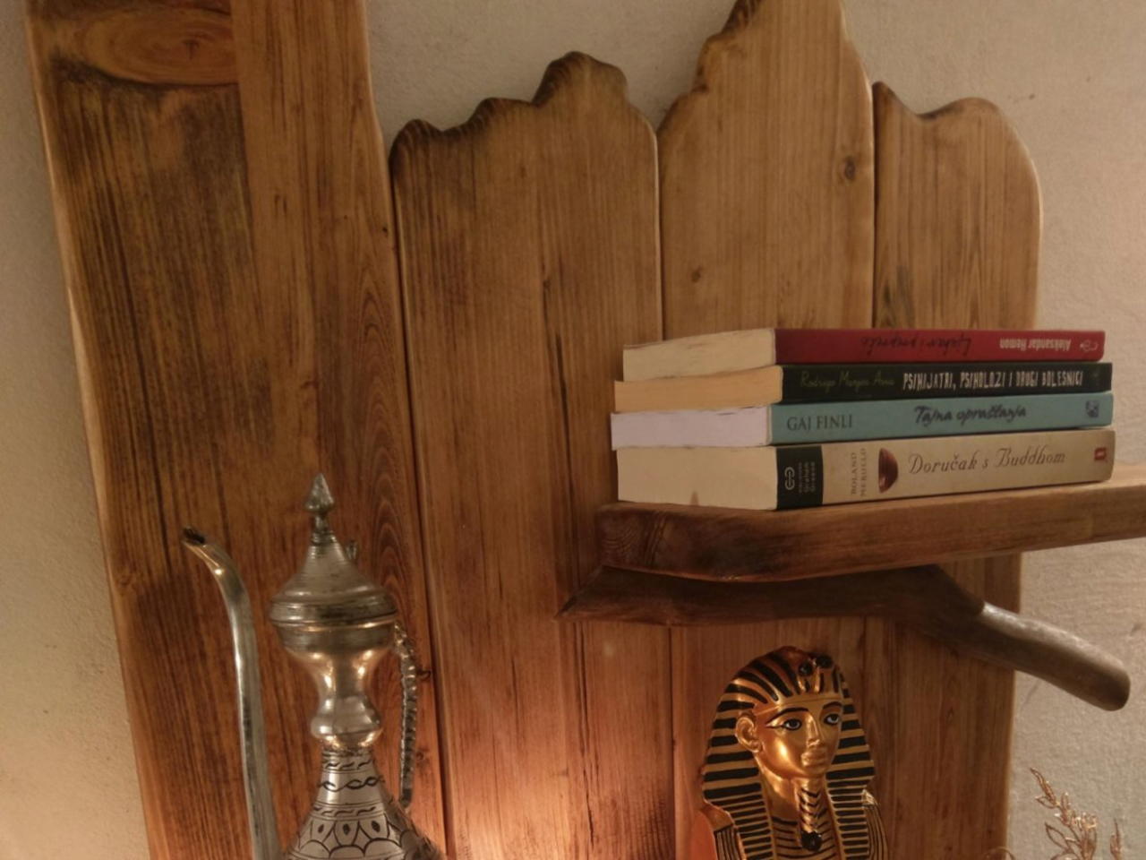 Made small router profiles on the back for the shelves to make it more stable, glue it and from.the back put few nails to hold it better, and coverd the nails with the swan profile from the back that can be mounted on a wall.Branches nailed from back