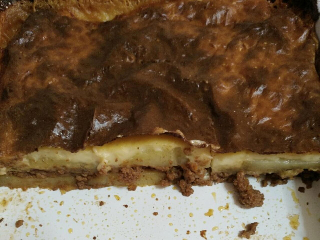 Βάζουμε μία στρώση πατάτες μετά ρίχνουμε τον κιμά μετά βάζουμε μία στρώση μελιτζάνες μετά τη δεύτερη στρώση πατάτες και τέλος ρίχνουμε την μπεσαμέλ και το βάζουμε στους 180 βαθμούς για μία ώρα καλή σας όρεξη
