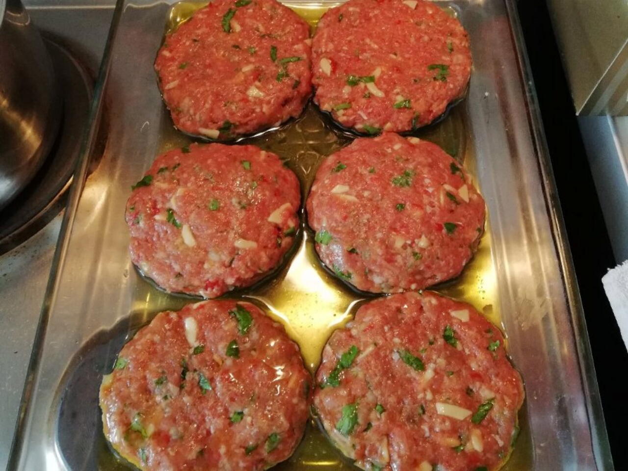 Ανακατεύουμε όλα τα υλικά μαζί εκτός το λεμόνι. Πλάθουμε τα μπιφτέκια λεπτά και μεγάλα, ψήνουμε στο γκριλ μέχρι να ροδίσουν και από τις δύο πλευρές. Στο πρώτο γύρισμα ρίχνουμε λεμόνι. Μετά το ψήσιμο τα γυρνάμε συνεχώς για να απορροφήσουν τη σάλτσα.