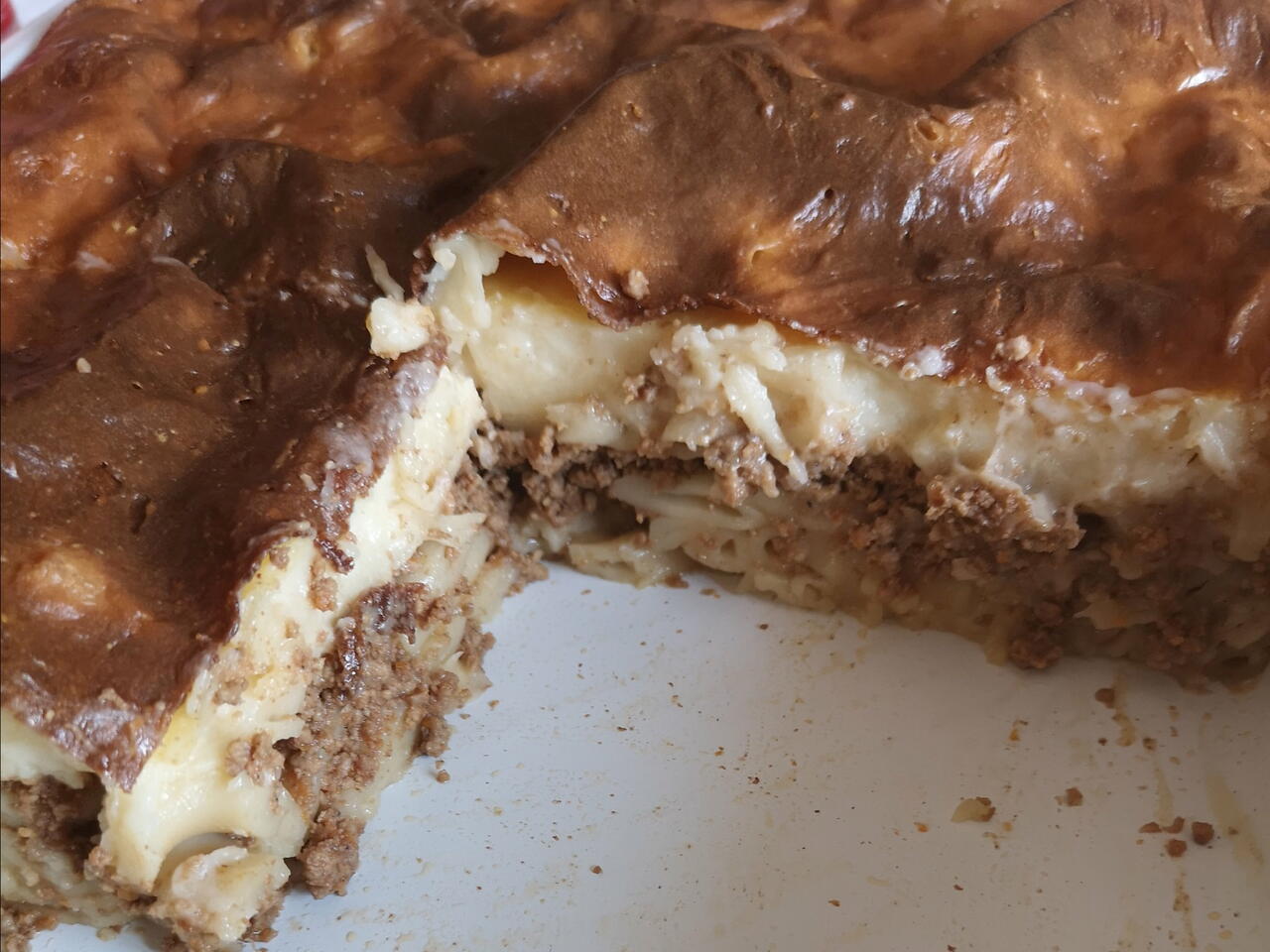 Ρίχνουμε μία στρώση μακαρόνια στο ταψί μετά στρώνουμε τον κιμά μετά ακόμα μία στρώση μακαρόνια και τέλος ρίχνουμε την μπεσαμέλ και είναι έτοιμο προθερμαίνουμε το φούρνο στους 200 βαθμούς Ανάλογα το φούρνο και το αφήνουμε να ψηθεί για 45 με 50 λεπτά ανάλογα με τον φούρνο
