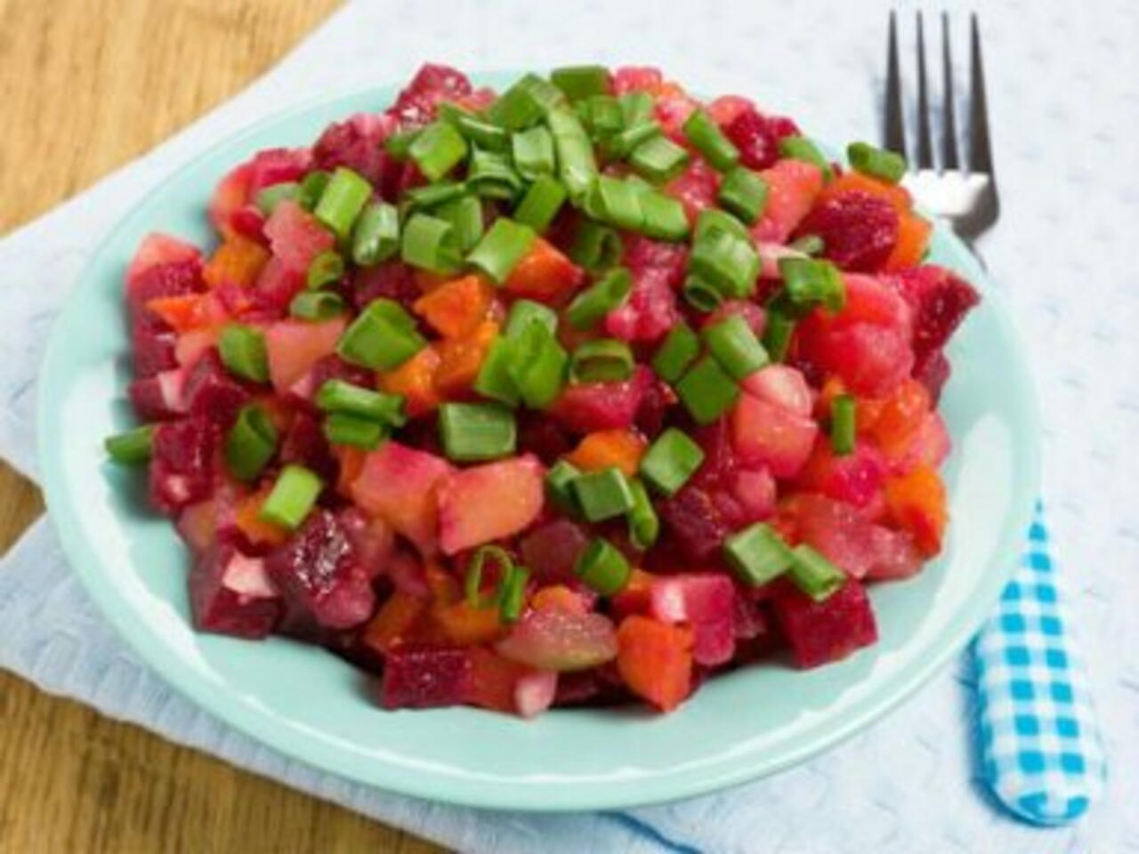 Βραζουμε τα υλικα μας οσα απο αυτα χρειαζονται βρασιμο. Τα ψιλοκοβουμε ολα τα υλικα σε μια μεγαλη σαλατιερα. Αλατοπιπερωνουμε ,ριχνουμε και λιγο λαδοξυδο και ανακατευουμε καλα. Εχουμε ως αποτελεσμα μια κοκκινη σαλατα.
