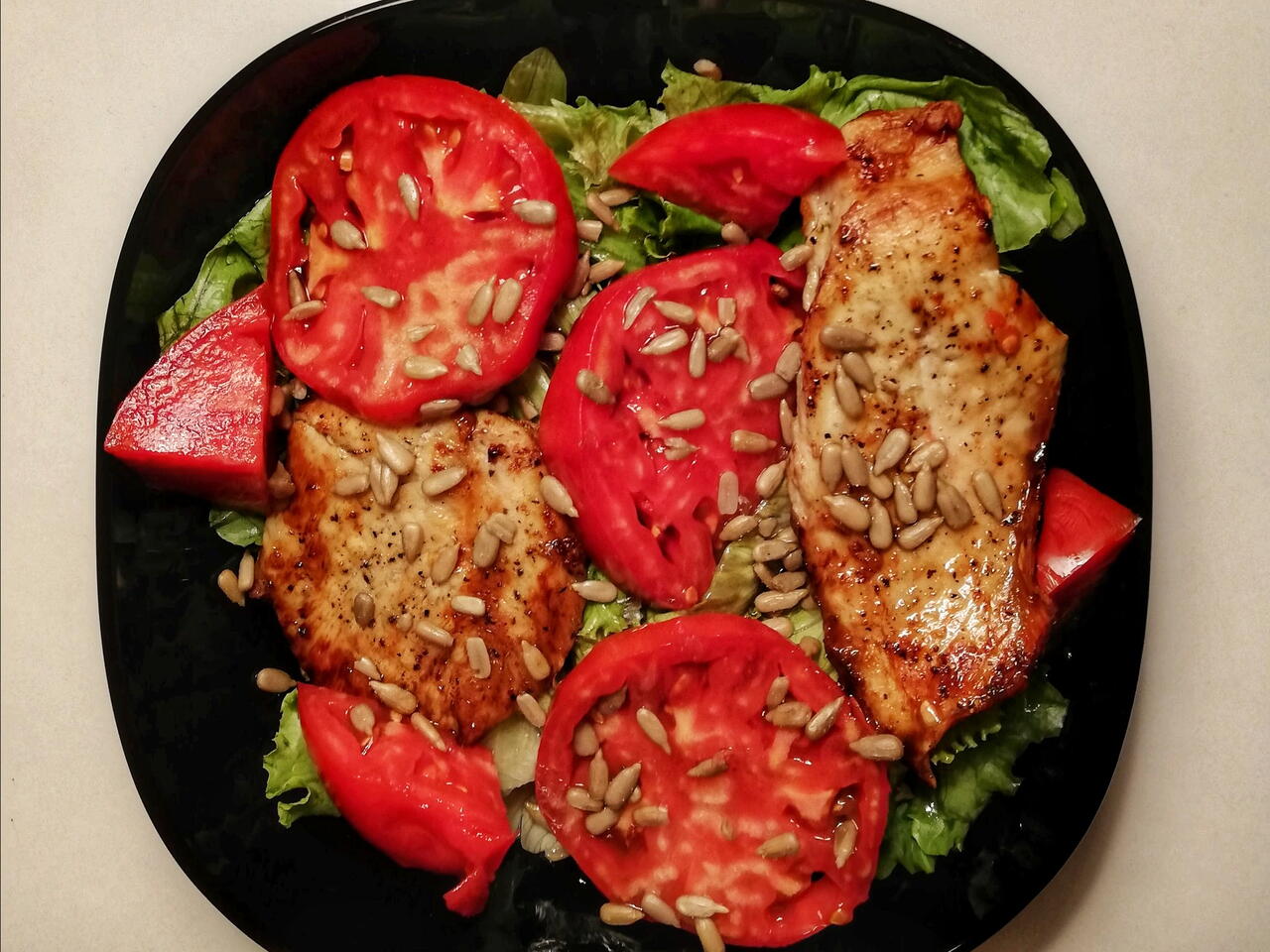 Piletinu ispeći na kokosovom ulju. Ja sam je začinila sa malo soli i papra. U tanjur dodati listove zelene salate i izrezati rajčicu.