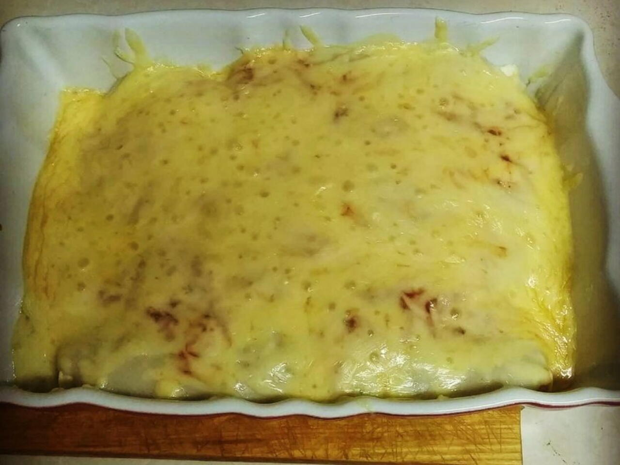 Preko toga preliti bešamel umak i to sve malo preliti sa pasiranom rajcicom i naribanim sirom i zapeći u pećnici na najvišoj temperaturi sve dok se sir ne rastopi.