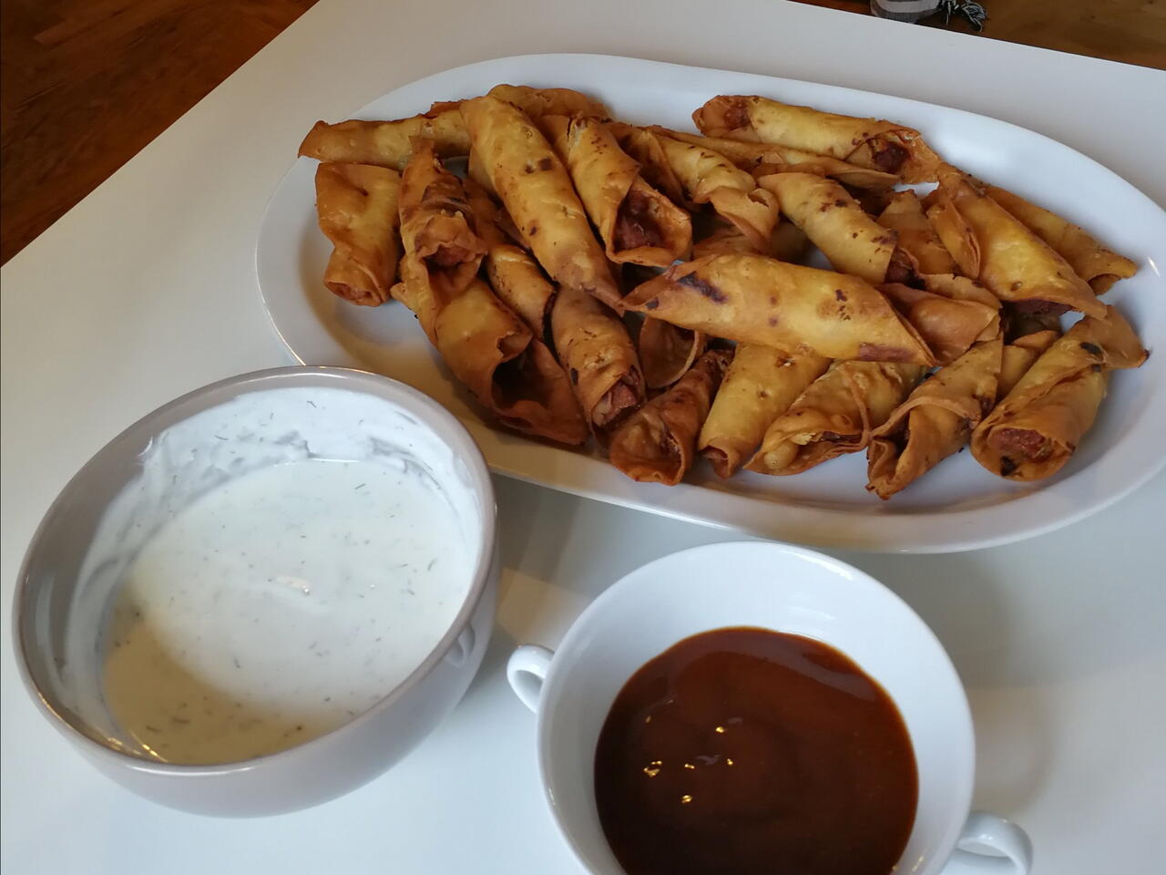 Napraviti domaće tortilje. Izrezati tortilju na trokutiće. Bijelo meso začiniti sa uljem, chillijem, paprom, soli. Zarolati u tortilje meso. Zatim provući čačkalice kroz svaku. Zagrijati ulje. Dok se ulje grije napraviti umak od običnog i grčkog jogurta. Staviti malo soli, papra, kopra. Staviti tortilje peci. Kada dobiju zlatnu boju izvaditi i staviti da se hlade😊🙌