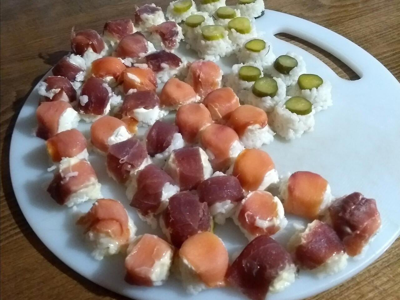 Najbolje je iskoristiti gumeni kalup za led. Ili postolje od nekih pralina ako nemate pri ruci ništa bolje. Na dno kalupa staviti komadić lososa, tune ili krastavca. Na to ide malo majoneze ili Philadelphie namaza, zatim riža.