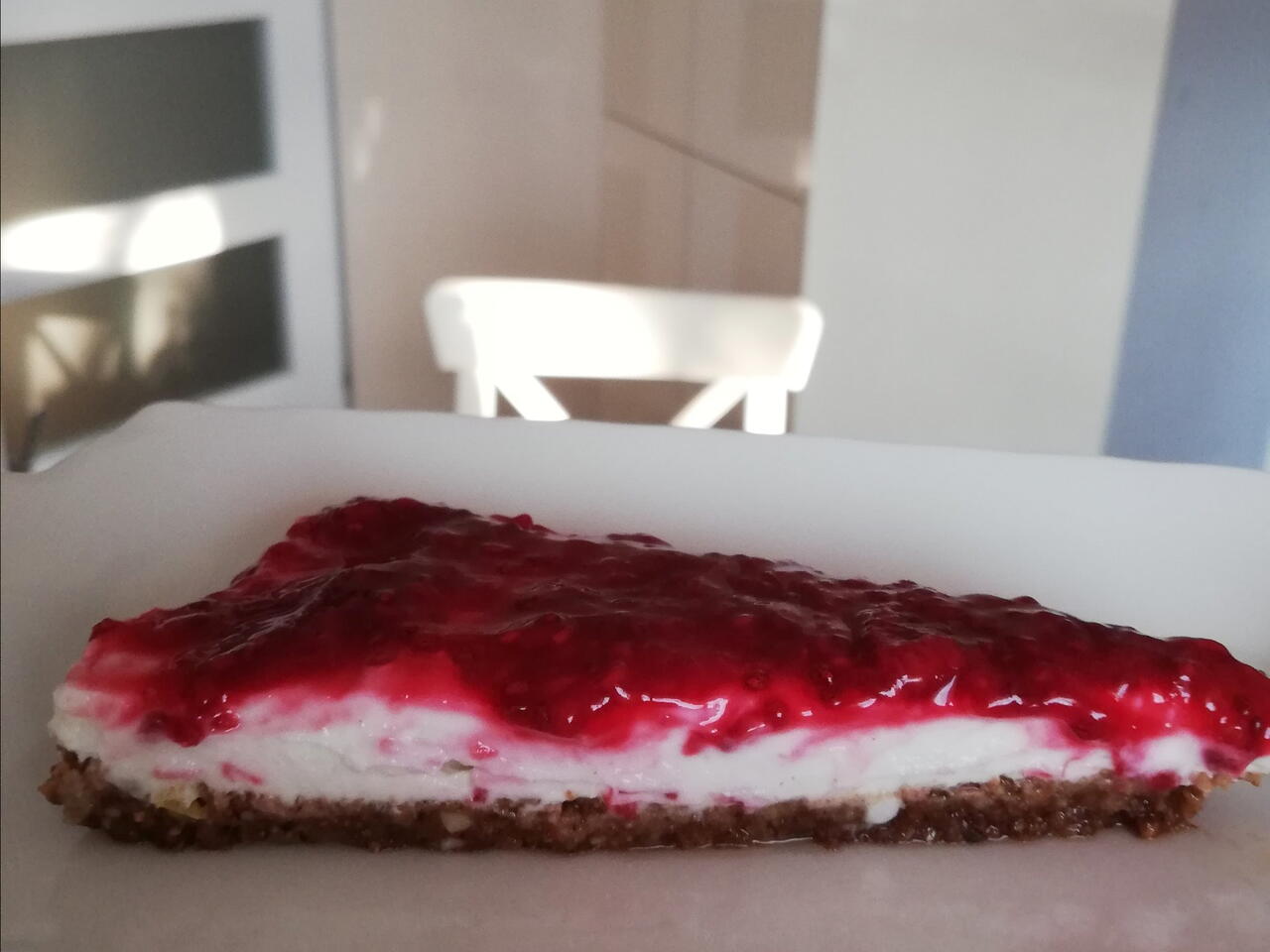 Bademe istostorati zatim ih samljeti. U zdjelu pomiješati bademe, kokosovo ulje te 2 žličice brezinog šećera (u nedostatku možete staviti smeđi šećer/steviju/med). Utisnuti smjesu u kalup. Za kremasti dio u uzdjeli pomiješate 500 grama posnog sira sa 2 žlice kiselog vrhnja. Ja sam još dodala malo limunove korice i burbon vaniliju. Prelijete u kalup i stavite u frižider na 4 sata.