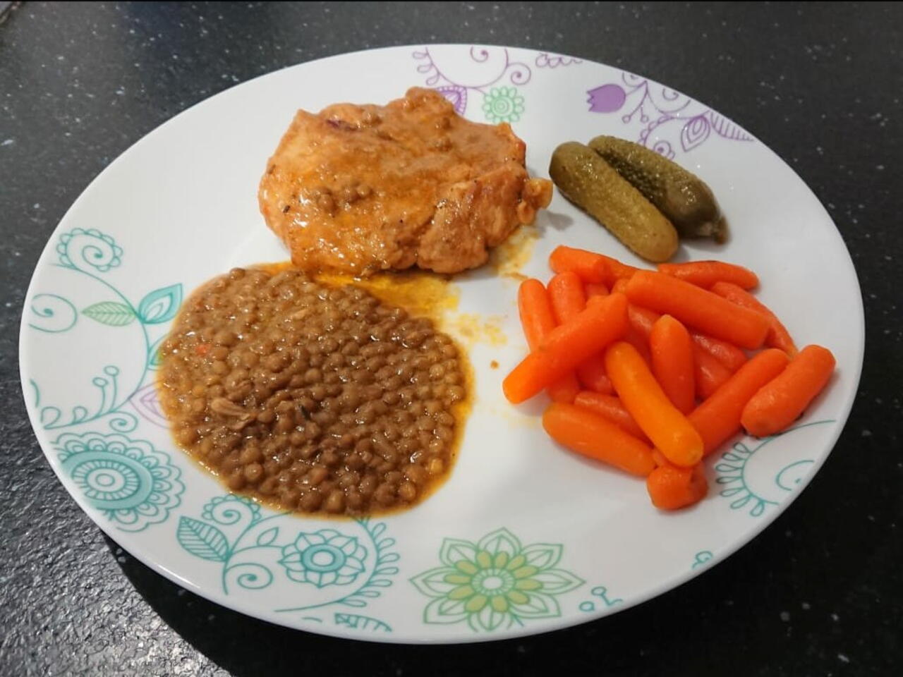 Kad se meso ispeče, izdvojiti u posudu, a na umak u tavu staviti leću. Miješati 5 minuta.