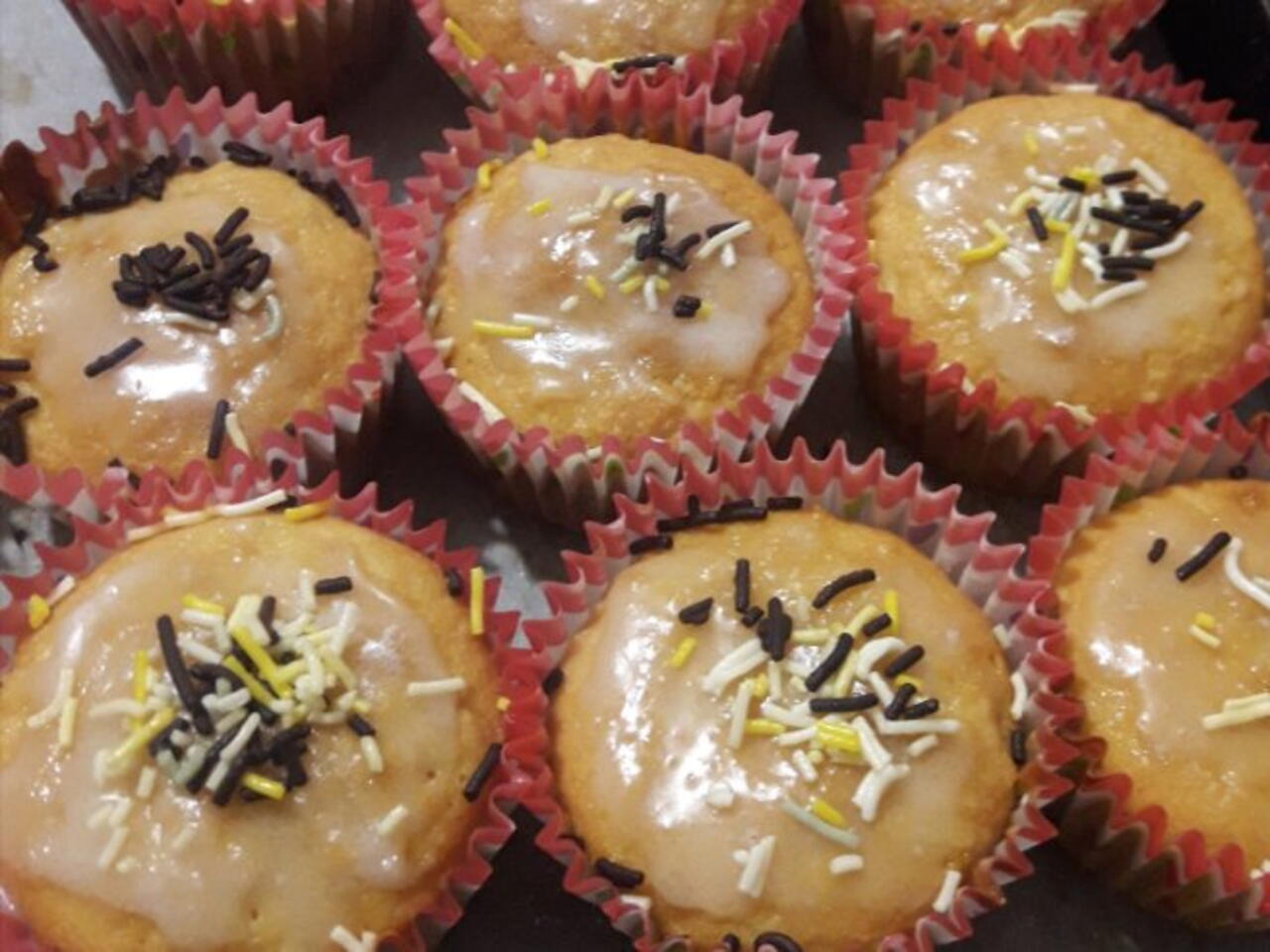 A cukor másik felét 3 evőkanál citromlé segítségével simává keverjük majd egy ecset segítségével megkenjük a kisült muffinokat. Tortadaraval vagy mogyoróval szórjuk meg míg a máz meg nem hült.
