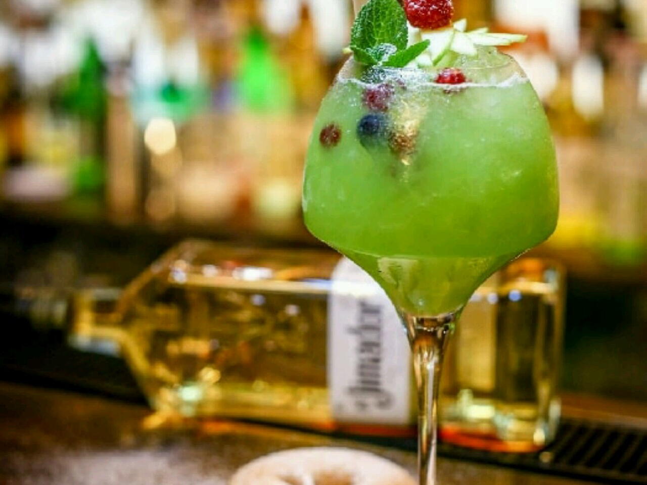 Az almát szeletekre vágjuk, a koktél almával, mentával és néhány szem málnával (akár fagyasztottal) díszítjük.