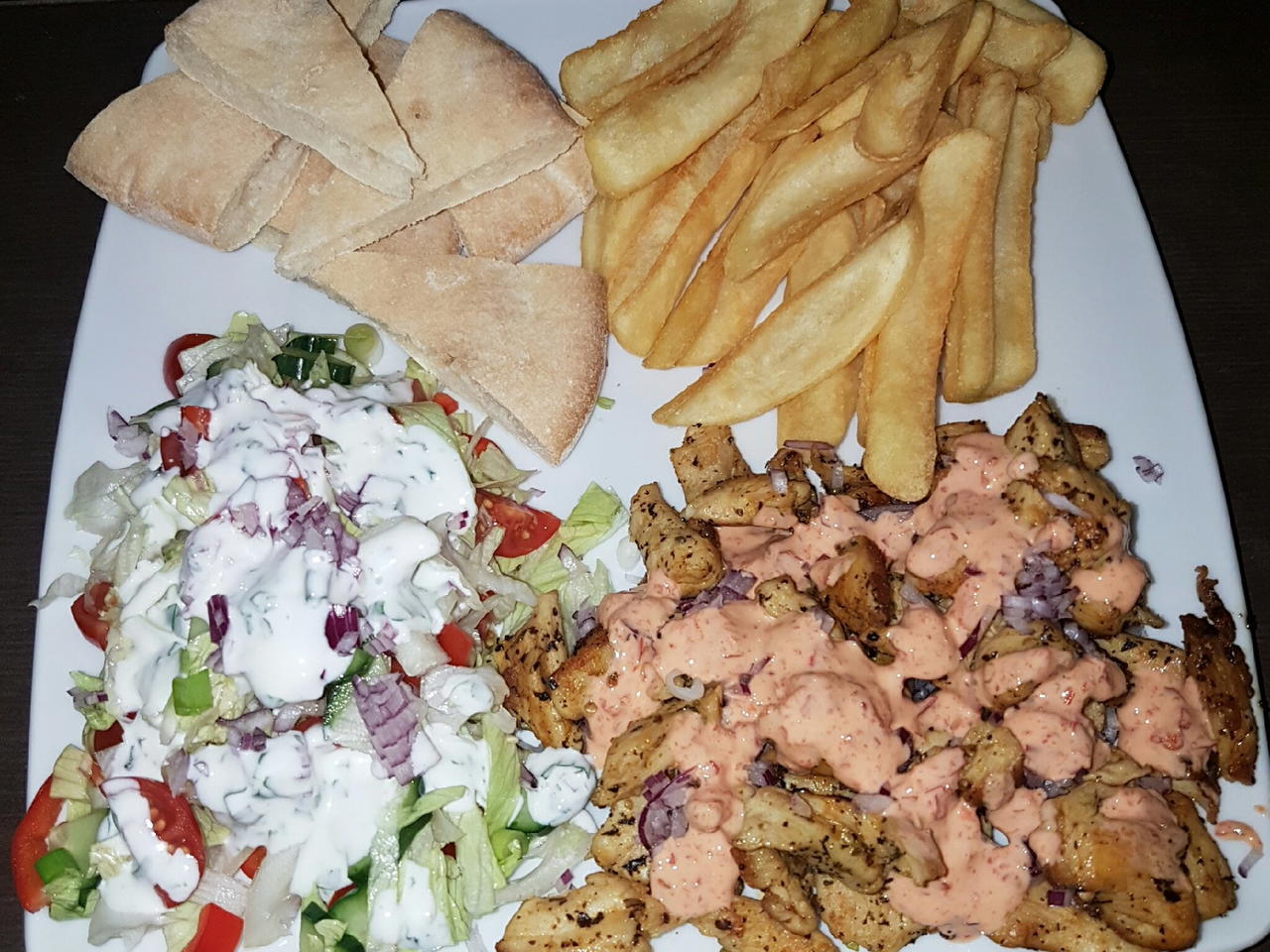 Tegye a salátát, a gyros húst, a házi pitát, és a sült krumplit a tányérra. A joghurtos dresszinget csepegtesse a salátára, a csípős dresszinget a húsra.