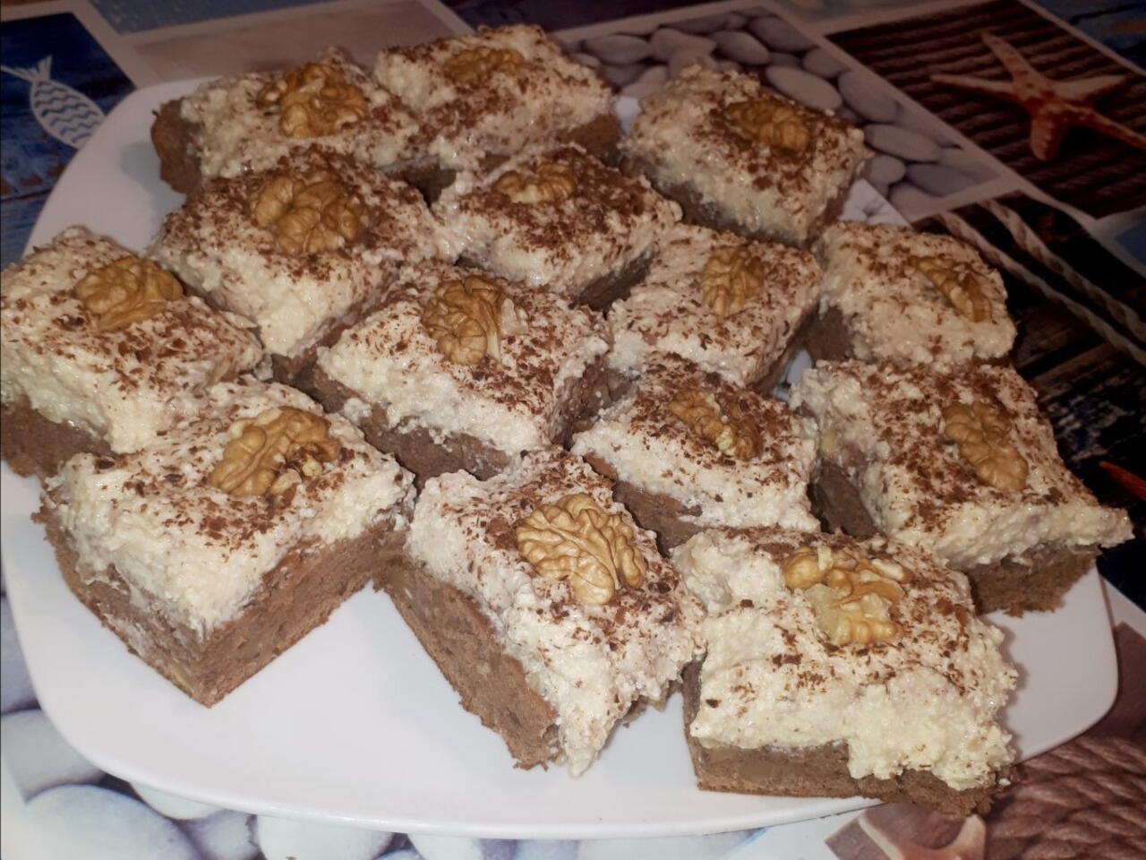 A piskótához a tojásokat kettéválasztjuk. A sárgájához adunk 4 kanál kristálycukrot, a fehérjéhez pedig 2 evőkanál cukrot. A fehérjét kemény habbá verjük, a sárgáját pedig habosra keverjük a cukorral, hozzáadjuk a kakaóport, majd beleszitáljuk a lisztet, hozzáadjuk a diót. Jól elkeverjük, majd a habbá vert tojásfehérjét óvatosan összeforgatjuk vele. Sütőpapírral bélelt tepsibe öntjük, majd előmelegített sütőben 180 fokon 20-25 perc alatt megsütjük.