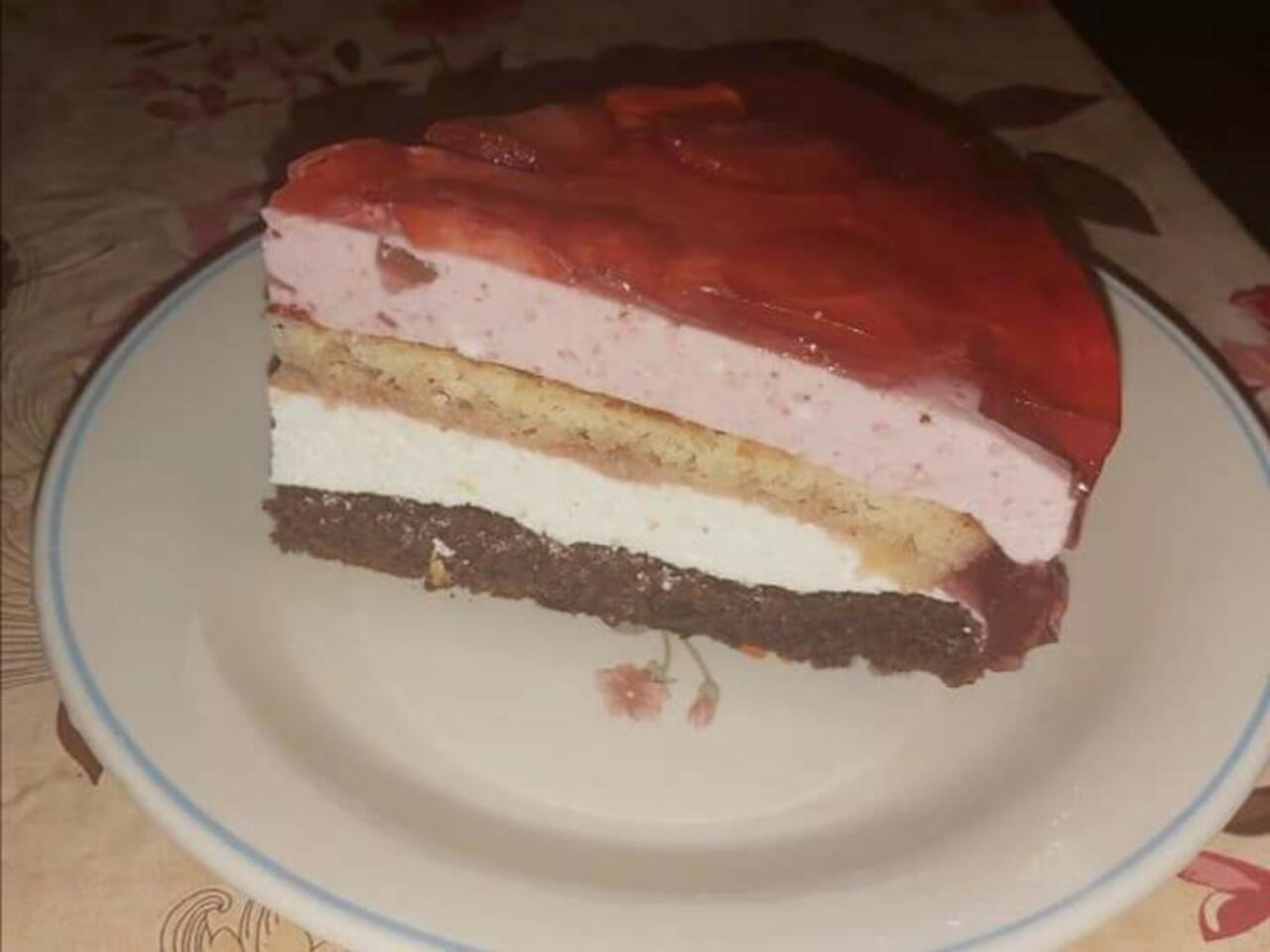 Amíg hűlnek a lapok, elkészítjük a túrókrémet. A túró 4 evőkanál porcukorral, 1 csomag vanilíás cukorral és egy citrom reszelt héjával összekeverjük. 1 dl vízbe beletesszünk a zselatint, belecsavarjuk a citrom levét és felmelegítjük. Amíg hűl, felverjük a 3 dl tejszínt, a habfixálóval és 2 evőkanál cukorral. A tejszínhab felét és a zselatin a túróba keverjük. A barna lapra rákenjük a túrókrémet, arra az eperdzsemet és ráhelyezzük a sárga lapot. Ezt félretesszük.