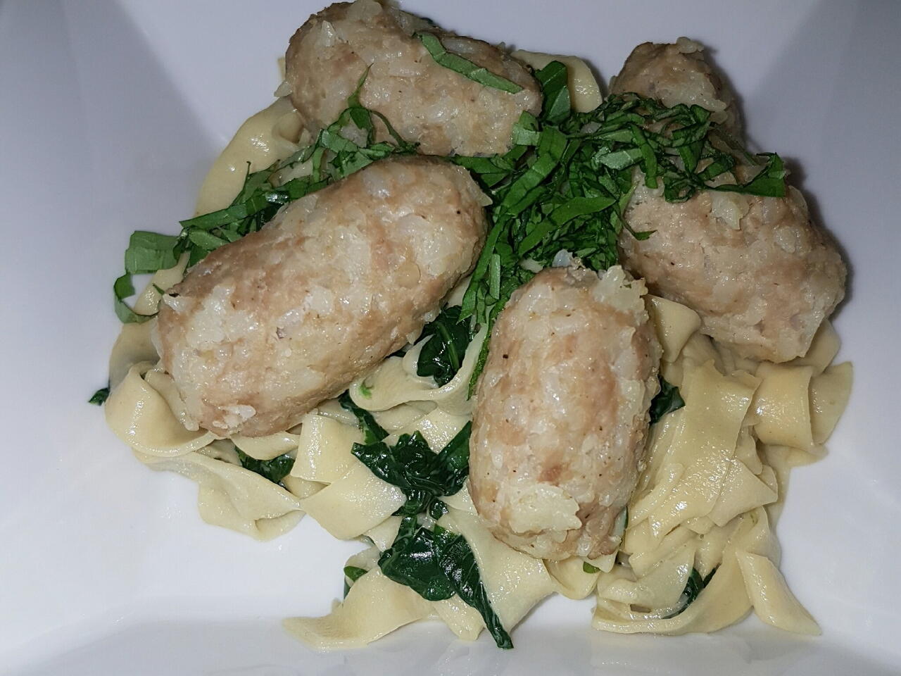 A tésztát szedje egy tányérba, helyzze rá a húsgombócokat, díszítse apróra vágott zöldfűszerrel.