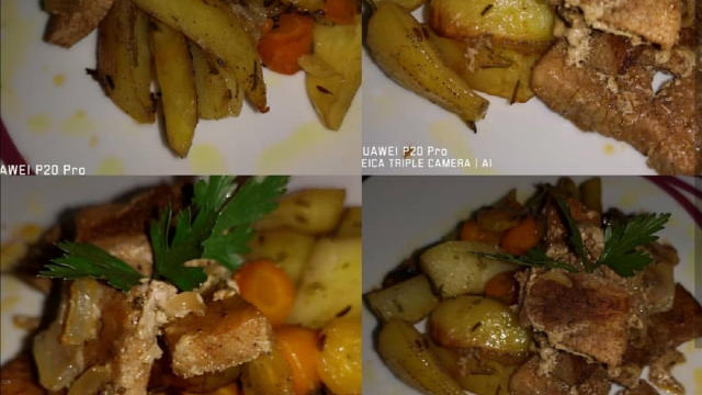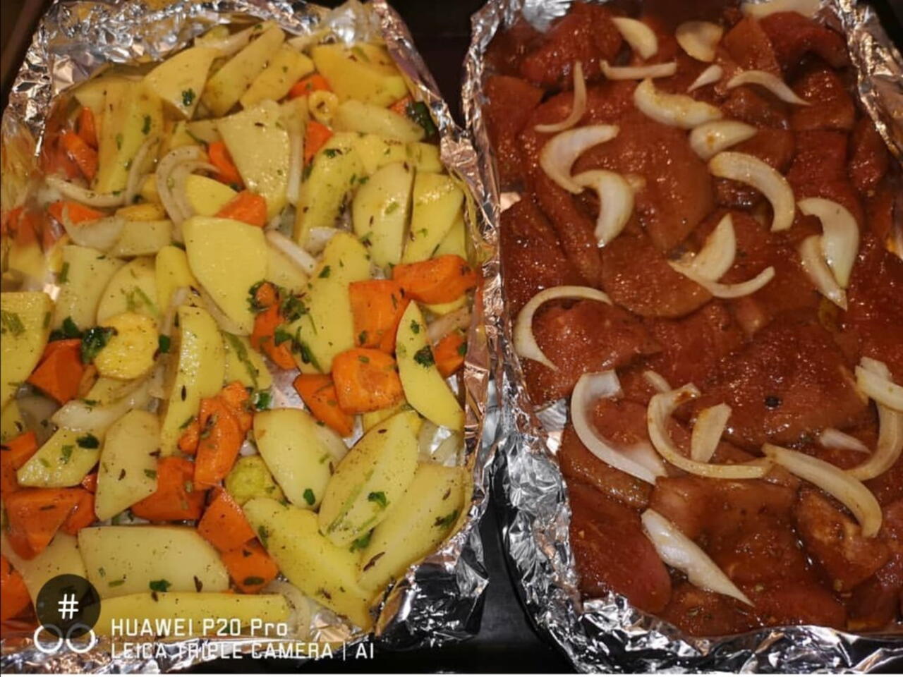 Először is cikkekre vágjuk a krumplit majd a sárga répát is aztán befuszerezzuk saját magunk szerint. A húst felszeteljuk szép nagy szeletekre aztán aztis fűszerezzük majd tepsibe rakjuk és a karikára vágott hagymát hozzá adjuk, 1-1,5 óra alatt készre sütjük