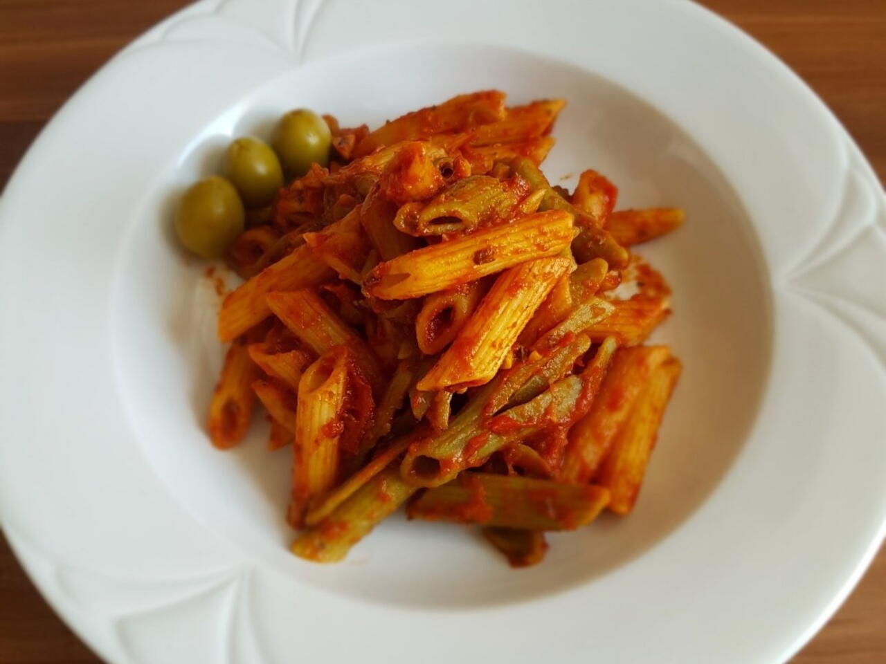 A tésztát leszűrjük. Az oliva bogyót felkarikázom és a paradicsomos szószba teszem. És végül az egészet összekeverjük egy nagyobb edényben.