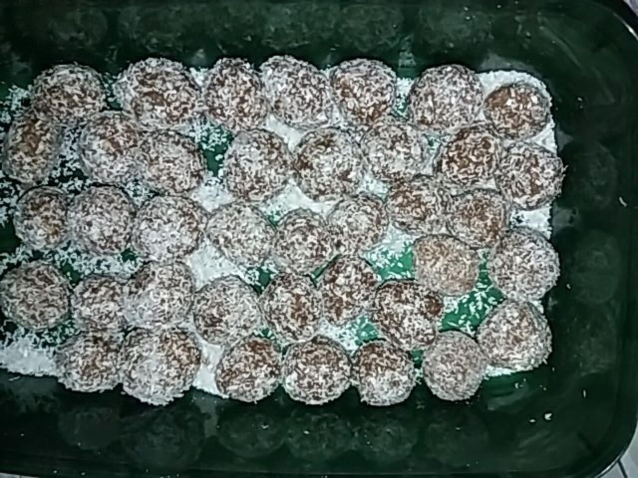 Nedves kézzel golyókat formálunk belőle. Utánna meg forgatjuk a kókuszreszelékbe.