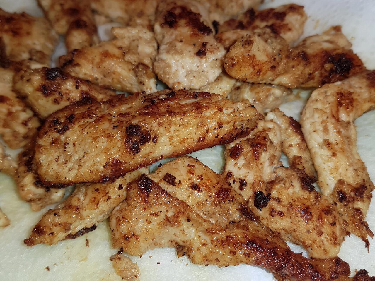 A csirkét megmossuk és felszeleteljük csíkokra.