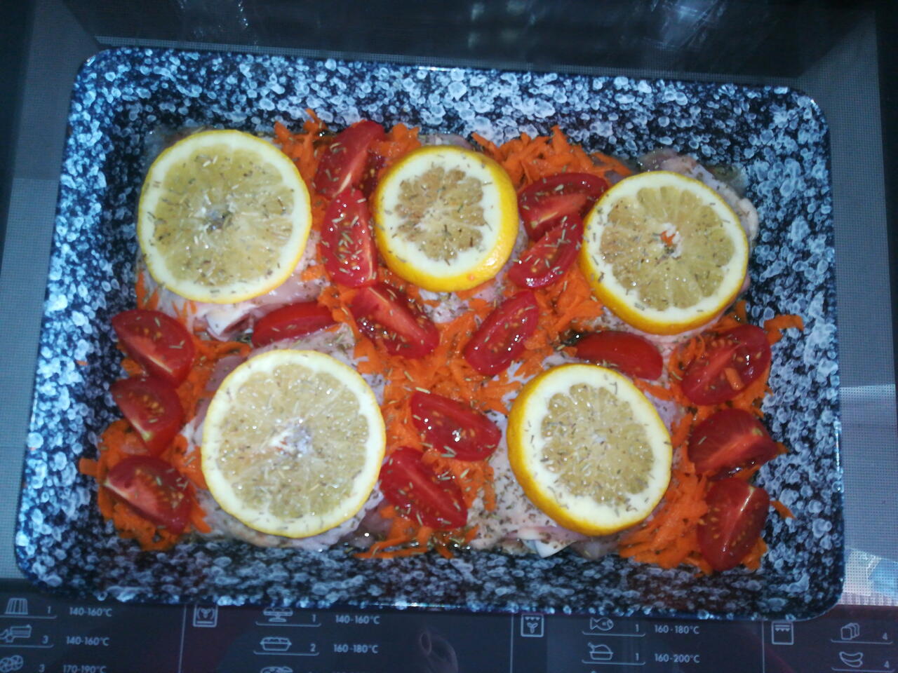 A citromot karikákra vágjuk és a combokra tesszük.(egy kicsit nyomkodjuk ki a levét, hogy ne legyen annyira intenzív citromos íze)
