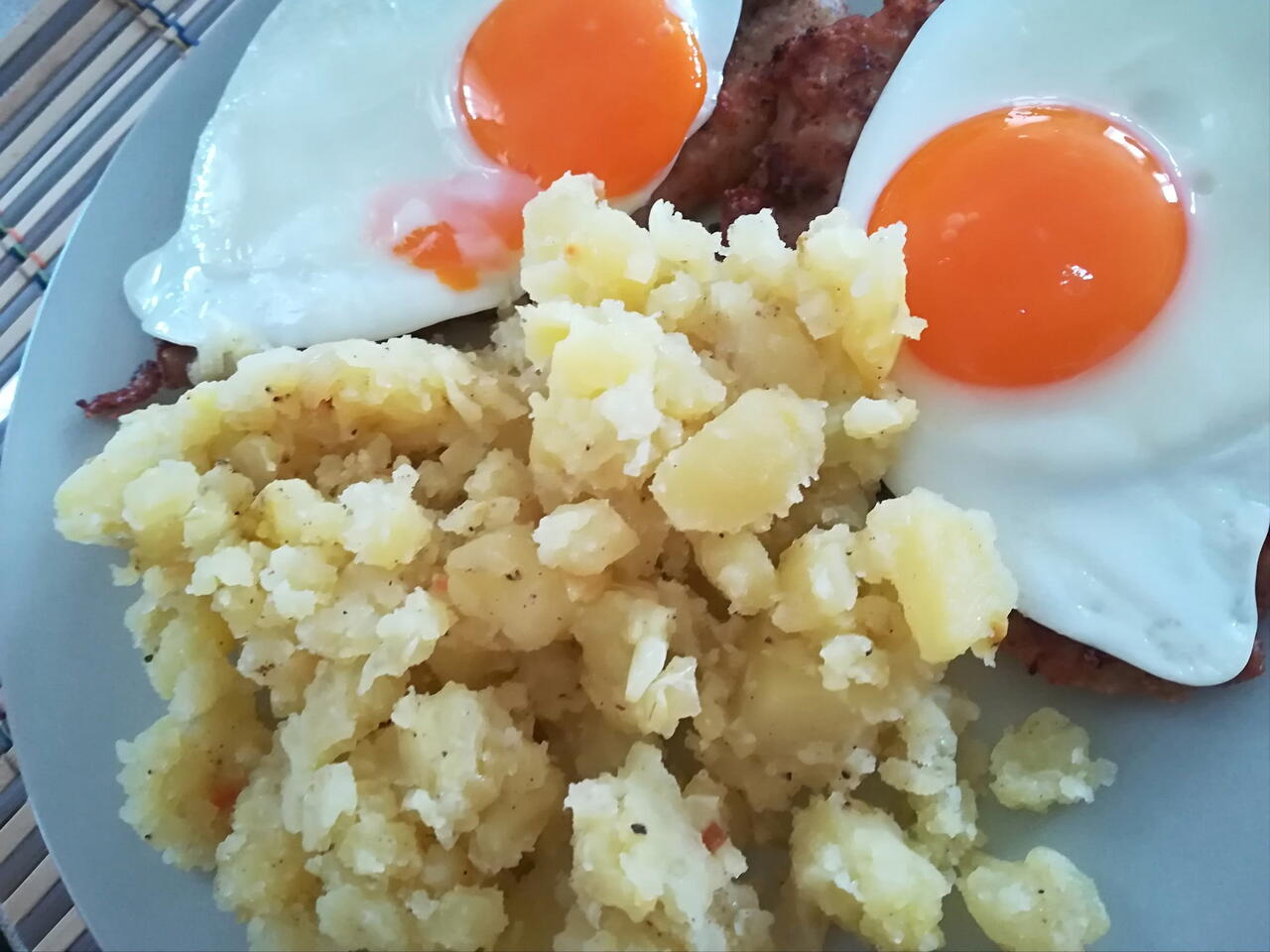 Közben sütünk tükörtojást,tálaláskor a hússzeletek tetejére tesszük.