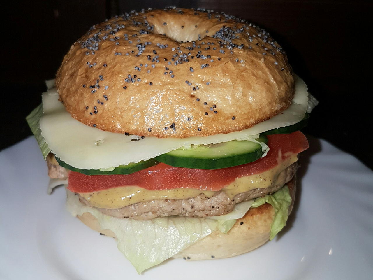 Darált sertéshús, vaj, trappista sajt, ementáli sajt, paradicsom, saláta, uborka, bagel, mustár.