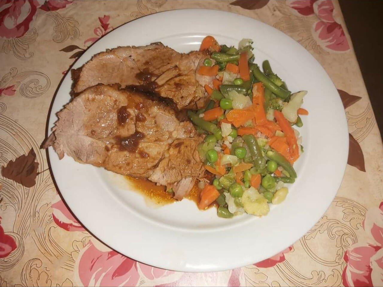 Miután elkészült eltávolítjuk a kötözőspárgát, a húst szeletekre vágjuk, majd párolt zöldségekkel tálaljuk.