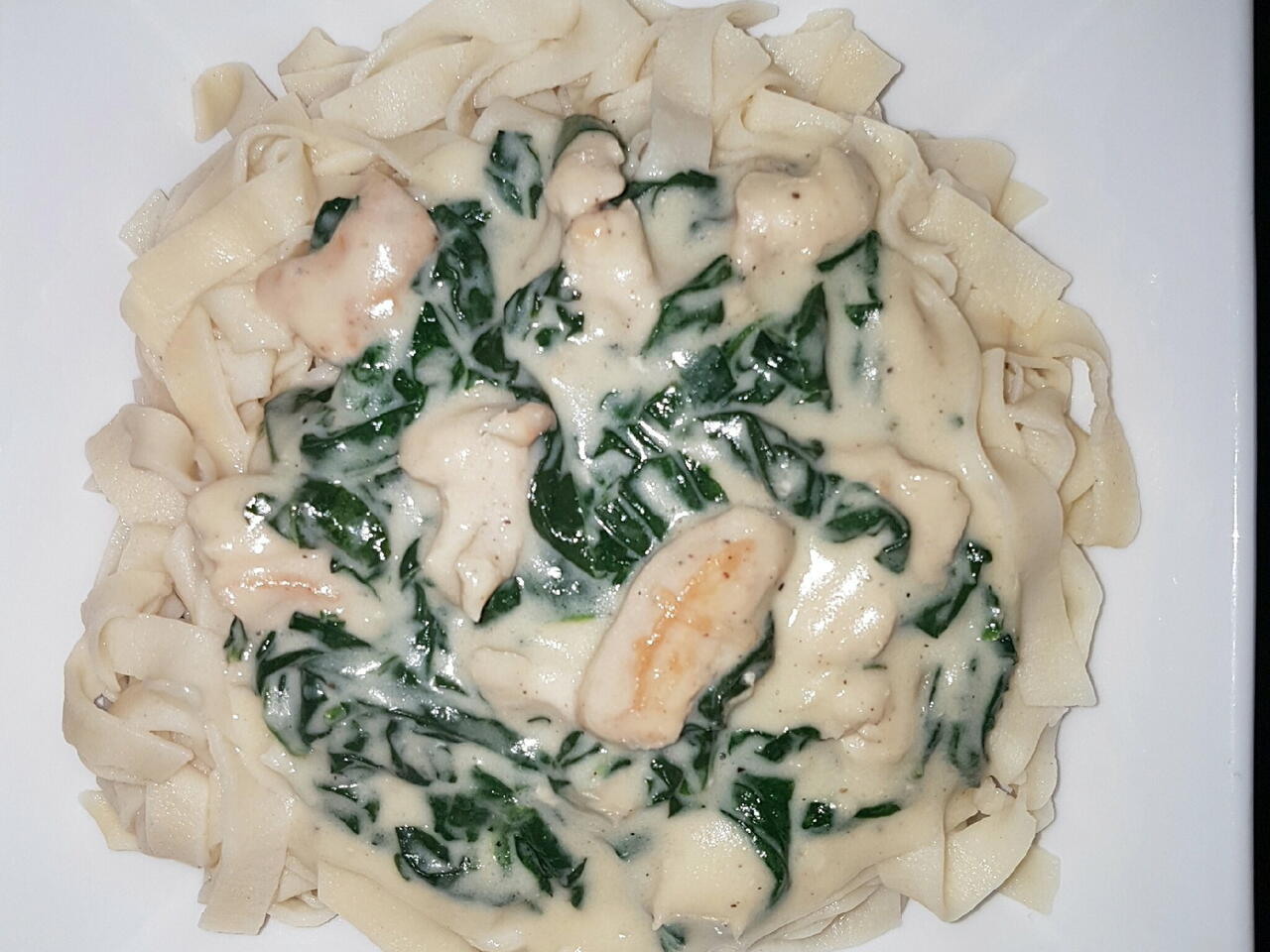 Szedje a spenótos-sajtos csirkét házi tésztára.