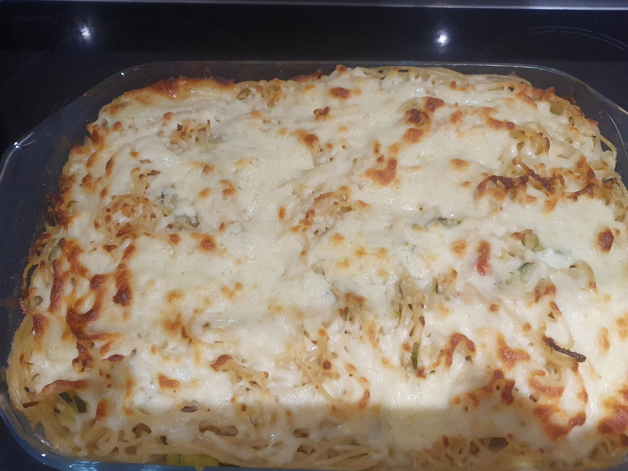 Ha elkészült a tejszínes cukkinink összekeverjük a tésztával egy tepsibe megszórjuk reszelt sajttal a tetejét és 180 fokos sütőben megpirítjuk. Kevesebb tésztával is lehet készíteni viszont akkor a tejet kilehet hagyni a receptből.