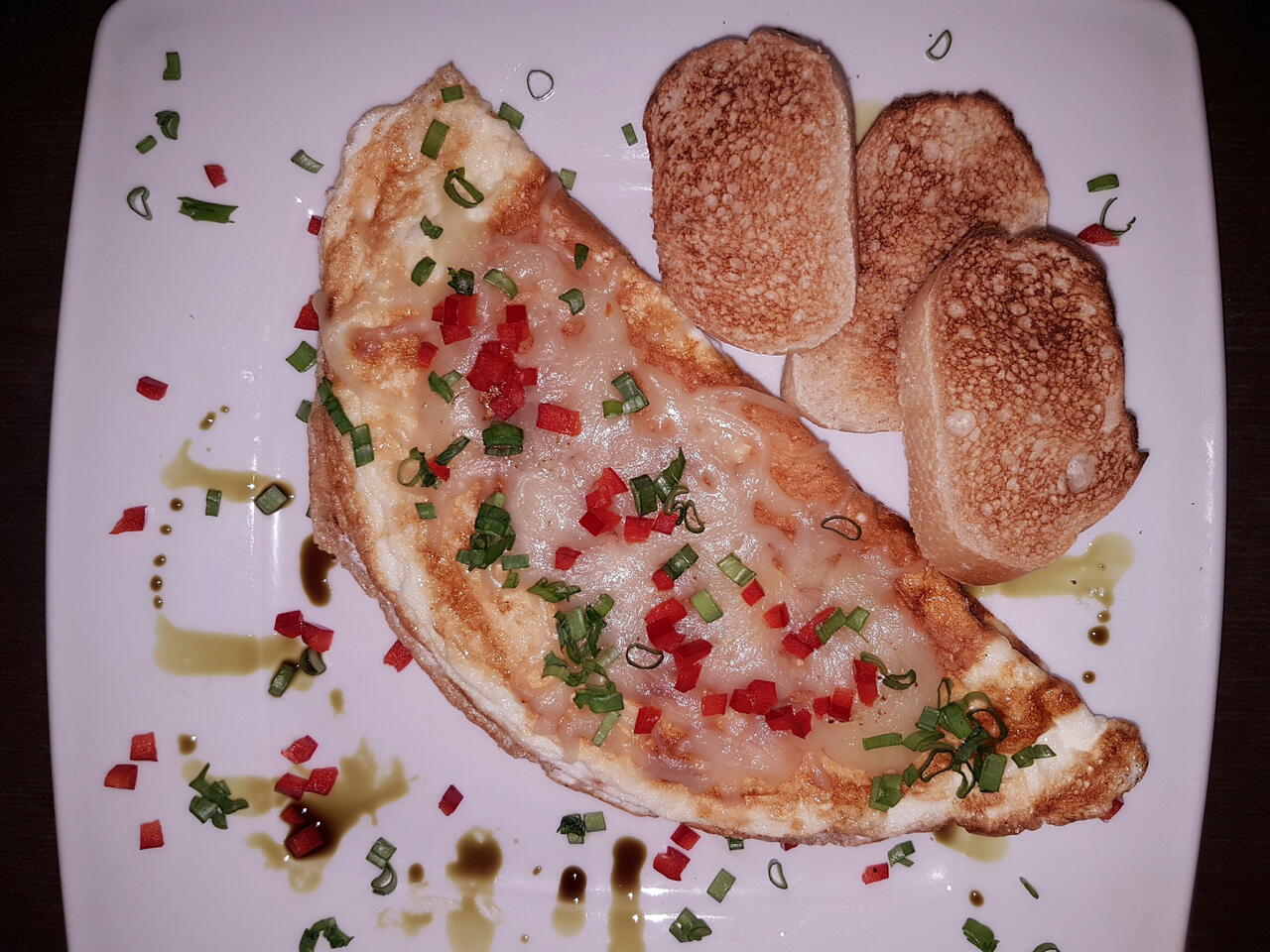 Az omlett tetejére szórjon apróra vágott paprikát és zöldhagymát. Pirított kenyérrel fogyassza. Jó étvágyat!